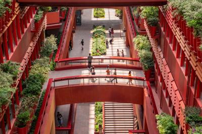 與現(xiàn)代上海常見的熙攘、喧囂的街道不同,里弄的近人尺度的微空間特質(zhì)自然地將人帶入到悠閑緩適的生活狀態(tài)中。鮮艷明快的紅磚與米黃色墻壁構(gòu)成的線性矮窄巷道;隨處可見的綠植盆栽 蔓延 繁茂生長在建筑表皮、角落、入口、陽臺和窗臺上,共同孕育出人與綠植、肆意共生的氛圍The roof 攜帶著其獨(dú)特的,真誠的城市文化基因,開啟了一個當(dāng)代城市發(fā)展的新篇章。