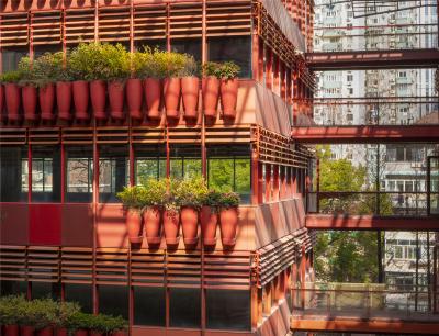 Unlike the hustle and bustle of contemporary Shanghai, the human scale environment of the Li’long (back streets) naturally takes people to a slower pace of life. It is these vivid red brick and beige framed linear corridors and the abundance of landscape in potted plants that climb, cascade, and thrive on every surface, corner, entrance, balcony and ledge that creates the natural forming and spontaneous biophilic environment intrinsic to the LiLong. The Roof represents a new era of contemporary urban development within its authentic cultural context.