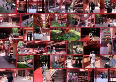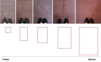 著眼于整個項(xiàng)目的細(xì)節(jié)設(shè)計,我們研究并設(shè)計了一種鋪裝的模塊體系,與立面的風(fēng)格,色彩協(xié)調(diào)統(tǒng)一。由外及里,完成了從城市界面尺度到近人視角尺度的轉(zhuǎn)變,主要通過設(shè)計色調(diào)和材料單位尺寸的變化來實(shí)現(xiàn)這種微妙的起承轉(zhuǎn)合。我們最終的設(shè)計選擇采用了紅色火成巖,營造從街景中的近人小單元空間到內(nèi)中庭的大單元空間的過渡與轉(zhuǎn)變。