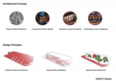 項(xiàng)目基地周圍環(huán)繞著活躍且豐富的商業(yè),生活和文化空間,所以項(xiàng)目設(shè)計在充分尊重周圍的城市肌理,空間尺度,生活方式,又為整個街區(qū)帶來在空間層次的細(xì)膩處理和與獨(dú)一無二的個性。為了融合傳統(tǒng)的里弄特色,項(xiàng)目最具可辨識度的點(diǎn)就是他的生態(tài)立面設(shè)計。