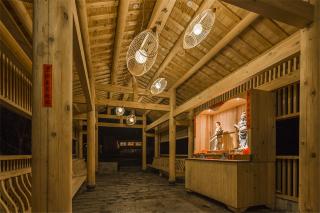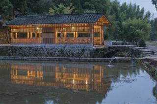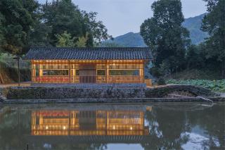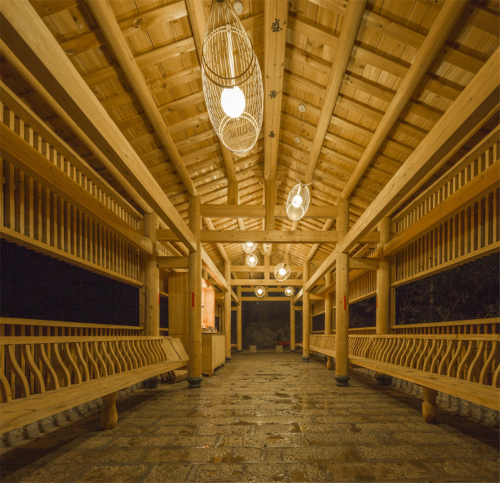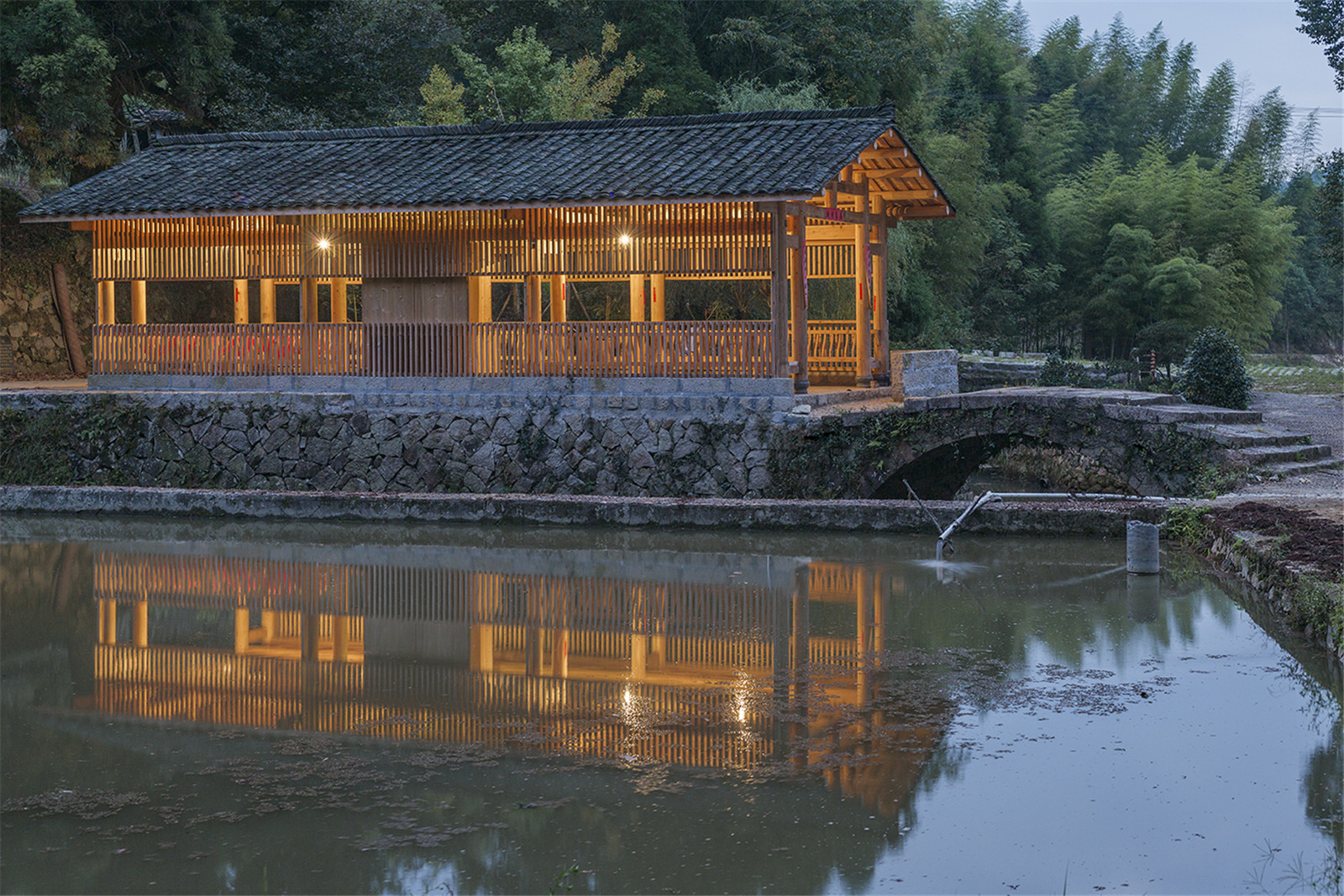 It needs to tear down the original pavilion with rubbery stone and to build a new one with more transparent corridor. It not only maintains traditional feng shui pattern of blocking sight and water, but also provides the good view for people who are sitting inside the corridor appreciating the surrounding scene and passers-by. Designers audaciously amend the external wall and create a semi- permeability effect by use of grilling on the basis of the raising-of-truss structure and open a landscape "window" in the semi-high position which is very modernistic at first glance but we can carefully see the regulations of Chinese traditional architecture of Tang and Song dynasties. The designers wish to establish an inheritance through the respect of the original faith and enable the locals to accept the new pavilion that the statues of worship for local people are well preserved and re-placed back to the original position of the new building. The lighting design further strengthens the symbolic spirit function of the village: at night, the returning villagers can see the lights at a very distant place that leads the way home.
