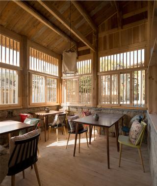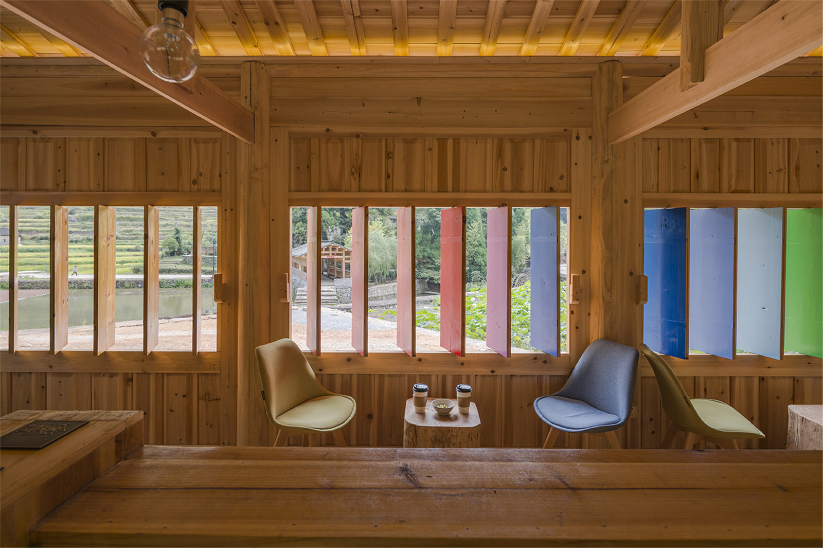 Clouds Cafe is a small house built on the original debris shed while keeping the form of local pergola, from which people can look down the pond in front. Shaped as a box with simple interior, the function of the building has been designed as a cafe for both locals and tourists to have a rest. For the facade facing to the village, the designers have adopt the wooden windows, one of whose sides are painted in color while another in plain, with axis to make a flexible while charming internal and external space. The designers hope that this new service facility will bring a dramatic "conflict" to the ancient village.
