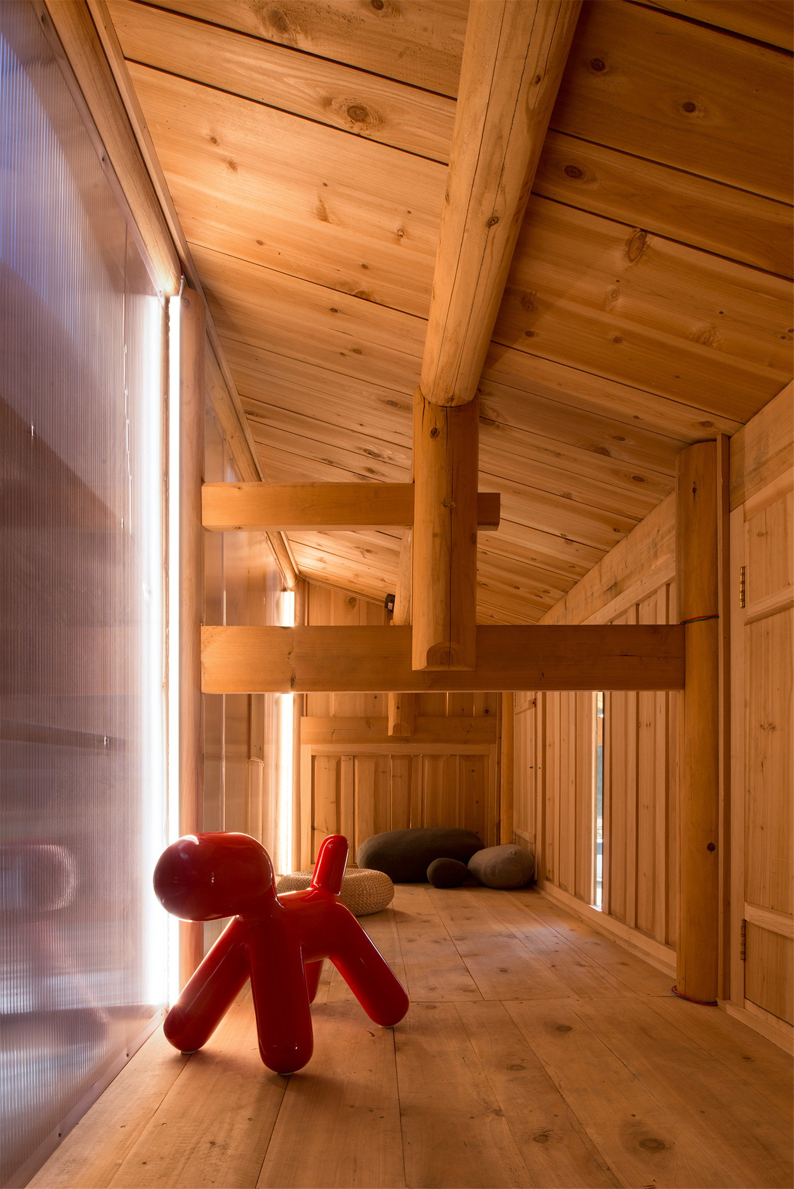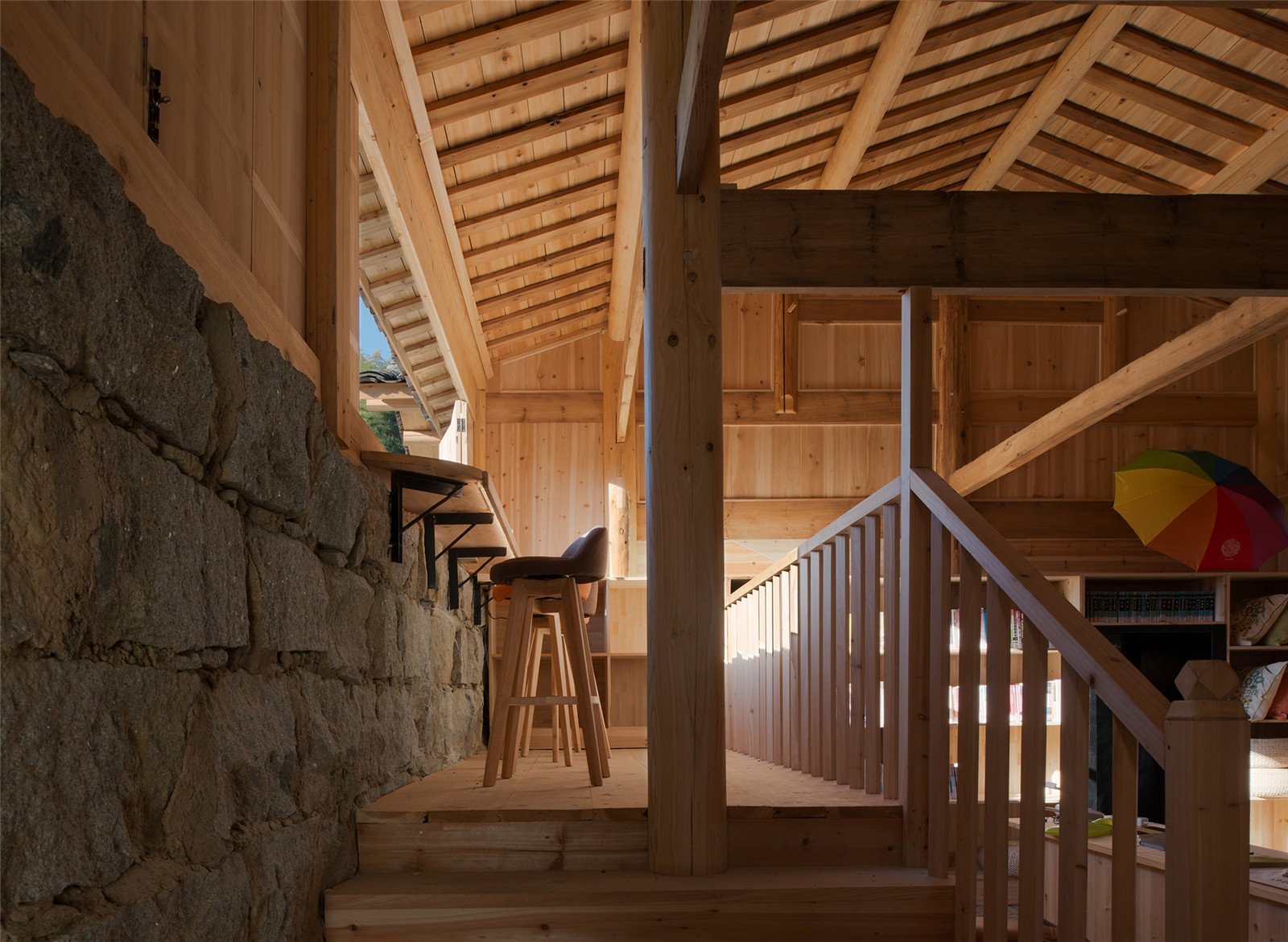 沿用了這個空間模式,但將上面的“木房子”稍微抬起,一方面增加下面空間的高度,另一方面將陽光引入原本黑暗的牛棚,這里將成為閱讀者的新窩,安靜、封閉,不受外部的干擾,唯一能打擾你讀書的是從兩層空間之間縫隙射入的一縷陽光。原有的毛石墻面被保留,懶人沙發(fā)被安置在地面上,柔軟對應(yīng)強硬,溫暖對應(yīng)冰冷,“新居民”對應(yīng)“老住戶”,戲劇性的沖突在對比中產(chǎn)生。二層的草料房被重新定義:原來的三個隔離的空間被打通,草料房的一半空間被吹拔取代,在吹拔空間與新草料房之間采用了陽光板隔墻,形成了半透明的效果;草料房仍然很低矮,進入的方式也必須從戶外爬梯子而入,很是不舒服,但這也是設(shè)計師有意為之。設(shè)計師希望這里的使用回到一種“慢”的原始狀態(tài),有點類似苦行僧的狀態(tài),使用者需要小心的體味身體與空間,把都市的張揚收起,在讀書中反思人與自然,人與環(huán)境的關(guān)系。