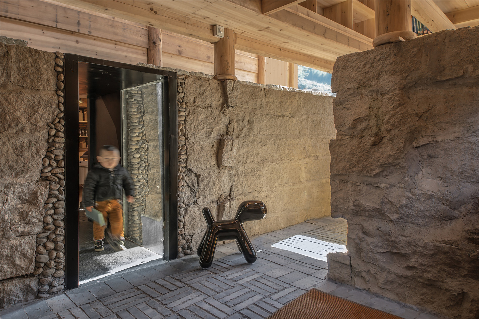 在前期的踏勘中,設(shè)計師發(fā)現(xiàn)現(xiàn)狀的雜物間和牛棚在空間上有很大差異。雜物間相對高大,內(nèi)部空間開放;而牛棚則正好相反,因為原有功能的需要,空間矮小,黑暗,幾個牛棚之間由毛石分隔,此外牛棚上面還有一個低矮的二層用于存放草料。利用原有空間的特點,設(shè)計團隊將新建筑定義為“一動一靜”兩個部分。