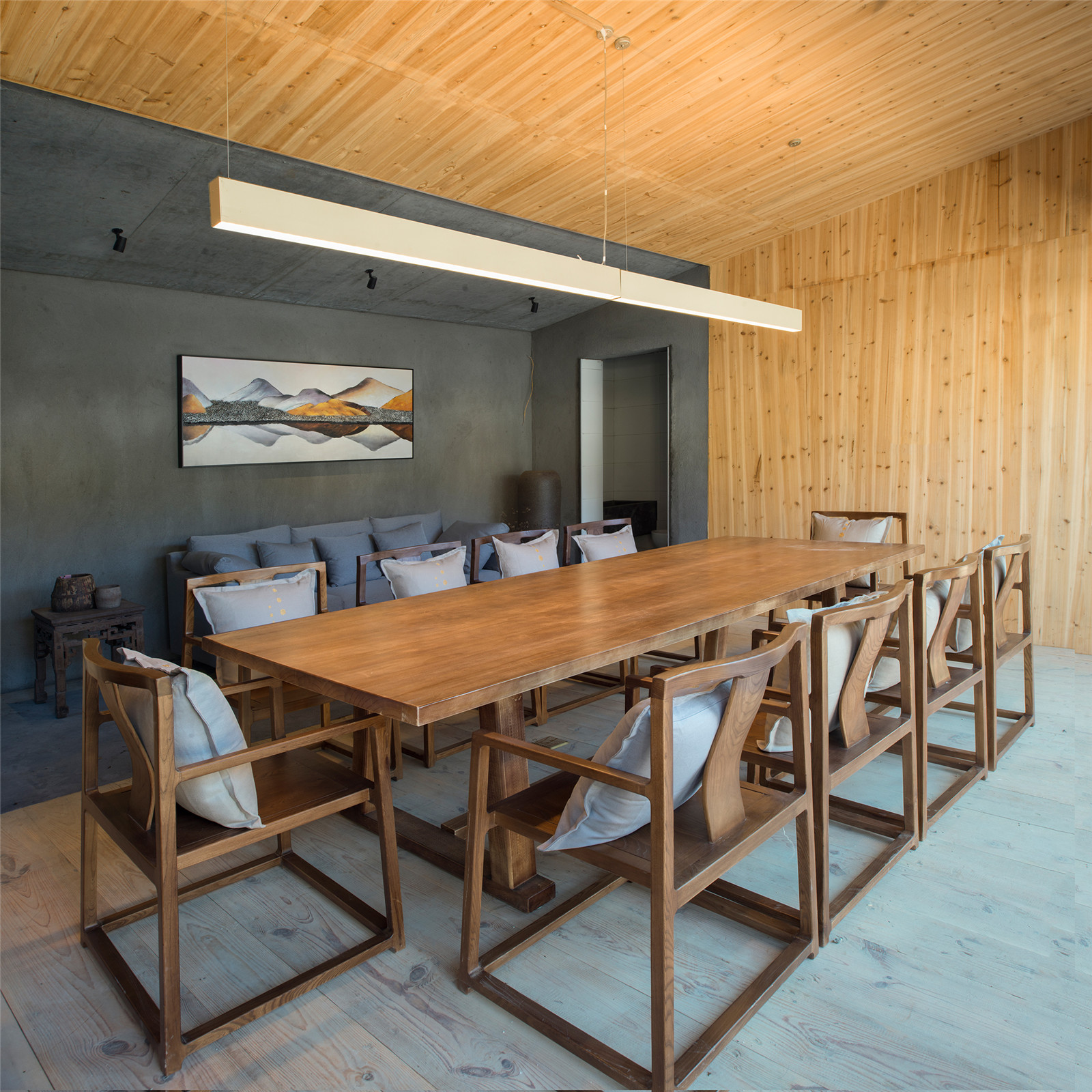 In the opposite of the building, the original surface across the stream is a solid wall with a high window on it. However, the landscape is so nice to be seen from the building that designer added a platform inside, on which people enjoy the view. This design principle maintains the existing relationship between interior and exterior. Thus, when people stay inside, stream is kept invisible for enjoying sound only. If visitors still wants to see the stream, one step on the platform makes it a great difference. A full-height glass window is embedded in the other side of the building to generate a new relationship with its’ neighbor, the village, to provide a great solution for better natural lights.