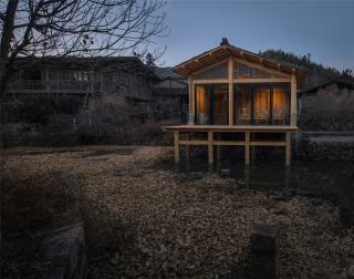 蓮舍是雜物間改造的茶室,也暗示了“廉潔”之意。原本的雜物間位于大夫第旁邊的一個水塘邊,水塘的存在使雜物間成為區(qū)域內(nèi)最顯眼的視覺焦點。設(shè)計保留了原有建筑的毛石圍擋,只對上層的木結(jié)構(gòu)進行了整修,將之改造為一個水邊的茶室。原有的老木材被盡量保留下來,重復使用;在朝向水面的一面,落地門窗和架在水上的平臺加強了建筑與水景的關(guān)系,也給新的使用者一個臨水而居的感覺。水塘內(nèi)的景觀也被重新梳理,原本半閑置的狀態(tài)被新的景觀元素——荷花所替代,從而與新改造的茶室向呼應(yīng)。