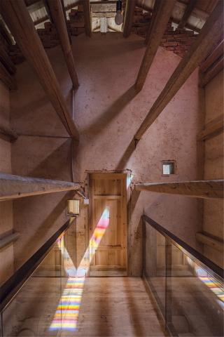 作為當?shù)剞r(nóng)業(yè)的傳統(tǒng)工藝遺存,烤煙房具有一定的旅游觀賞價值,可以滿足城市人對傳統(tǒng)制煙工藝的好奇。但設(shè)計團隊并不希望把改造工作停留在原有工法的簡單再現(xiàn)上,一種藝術(shù)的手法被引入,通過一個光和色彩的裝置,烤煙房被塑造成對中華農(nóng)耕文明,及其緊密相關(guān)的太陽的歌頌。陽光被分解和強化為彩色的光,從天窗照入室內(nèi)空間,奇幻的光影效果為簡單的空間提供了浪漫的色彩。設(shè)計師希望這里成為一個儀式性的場所,通過反映太陽的藝術(shù)裝置,現(xiàn)代人可以反思人與自然的關(guān)系。