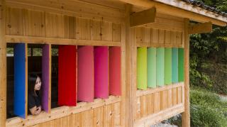 建在原來場地中雜物棚的基地上。它是一個不大的小房子,基本保持了當?shù)氐呐锛艿母窬郑敫呒芗s1.5米,人在其間,可以從高處俯視面前的荷塘,從而完成村莊整體格局中的“觀水”主題。建筑的功能是水吧,設(shè)計師希望它成為村口供人歇腳的場所。因為空間不大,所以內(nèi)部格局不復雜,就是一個簡單的方盒子。面向村莊的立面,采用了中軸的木窗板,使內(nèi)外空間形成靈活多變的可能性。窗板并沒有墨守成規(guī),而是將一側(cè)油漆成七彩的顏色,這樣無論是遠觀,還是在室內(nèi),建筑都平添了一抹嫵媚。設(shè)計師希望,這個新的服務(wù)設(shè)施能為古老村莊帶來一點戲劇性的“沖突”。
