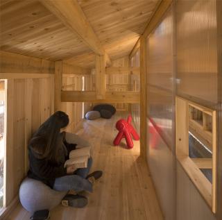 ▼ “靜雅”書吧內(nèi),“木房子”被稍微抬起,將陽光引入原本黑暗的牛棚