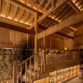 “一靜”是讀書、靜思的空間,稱之為“靜雅”。它由牛棚改造而成。設(shè)計師認為原有建筑最有意思的空間模式是上下兩層相互獨立又聯(lián)系的結(jié)構(gòu):下面為牛生活的地方,由毛石磊筑而成,狹小、黑暗;上面是存放草料的地方,木結(jié)構(gòu),同樣狹小,相對黑暗;上面的“木房子”是直接放在下面的石頭圍子墻上的,它們之間在物理流線(上面的空間不會通過下面的空間進入)上是分離的,但在使用邏輯(牛吃草)上是關(guān)聯(lián)的。