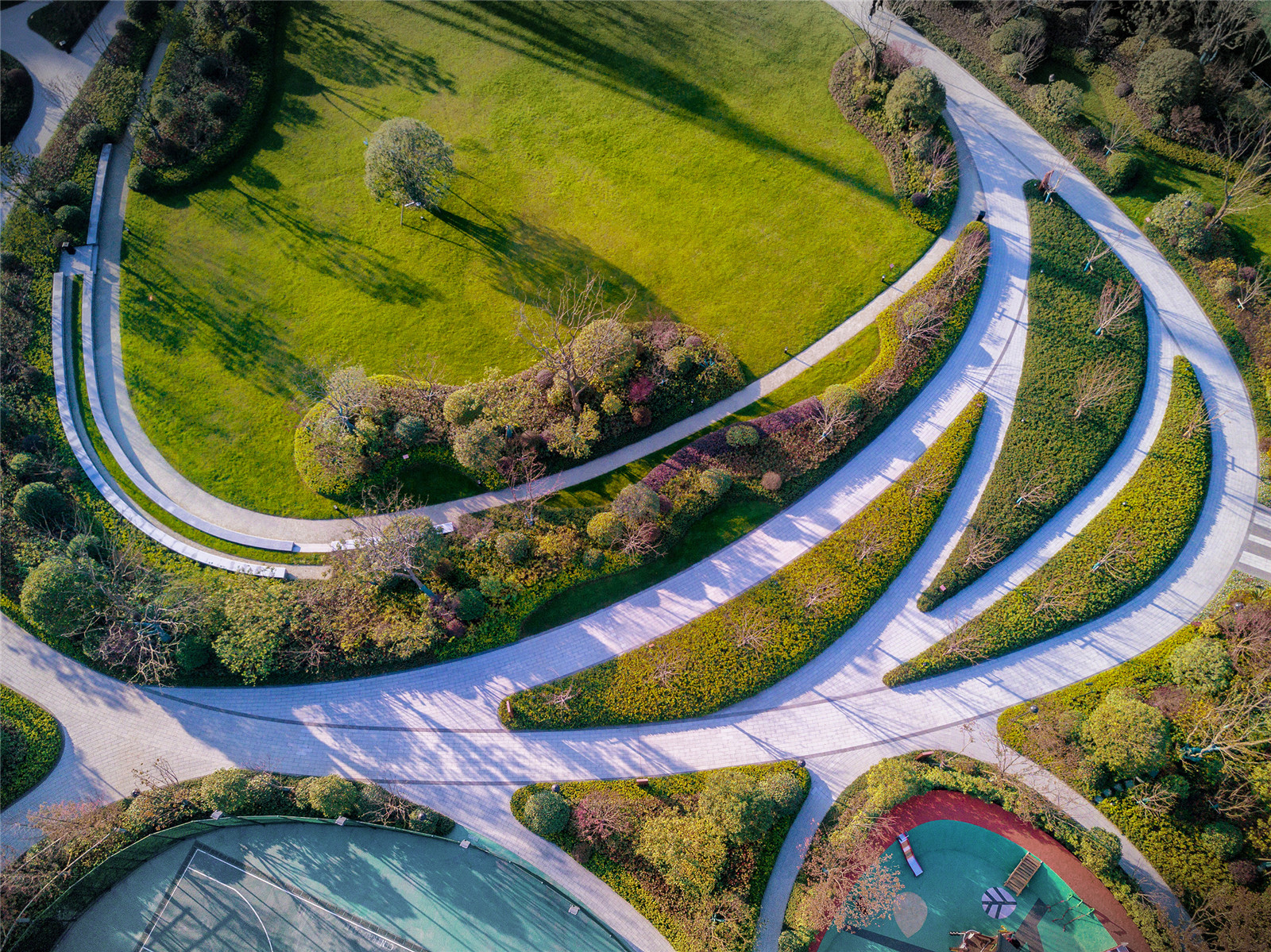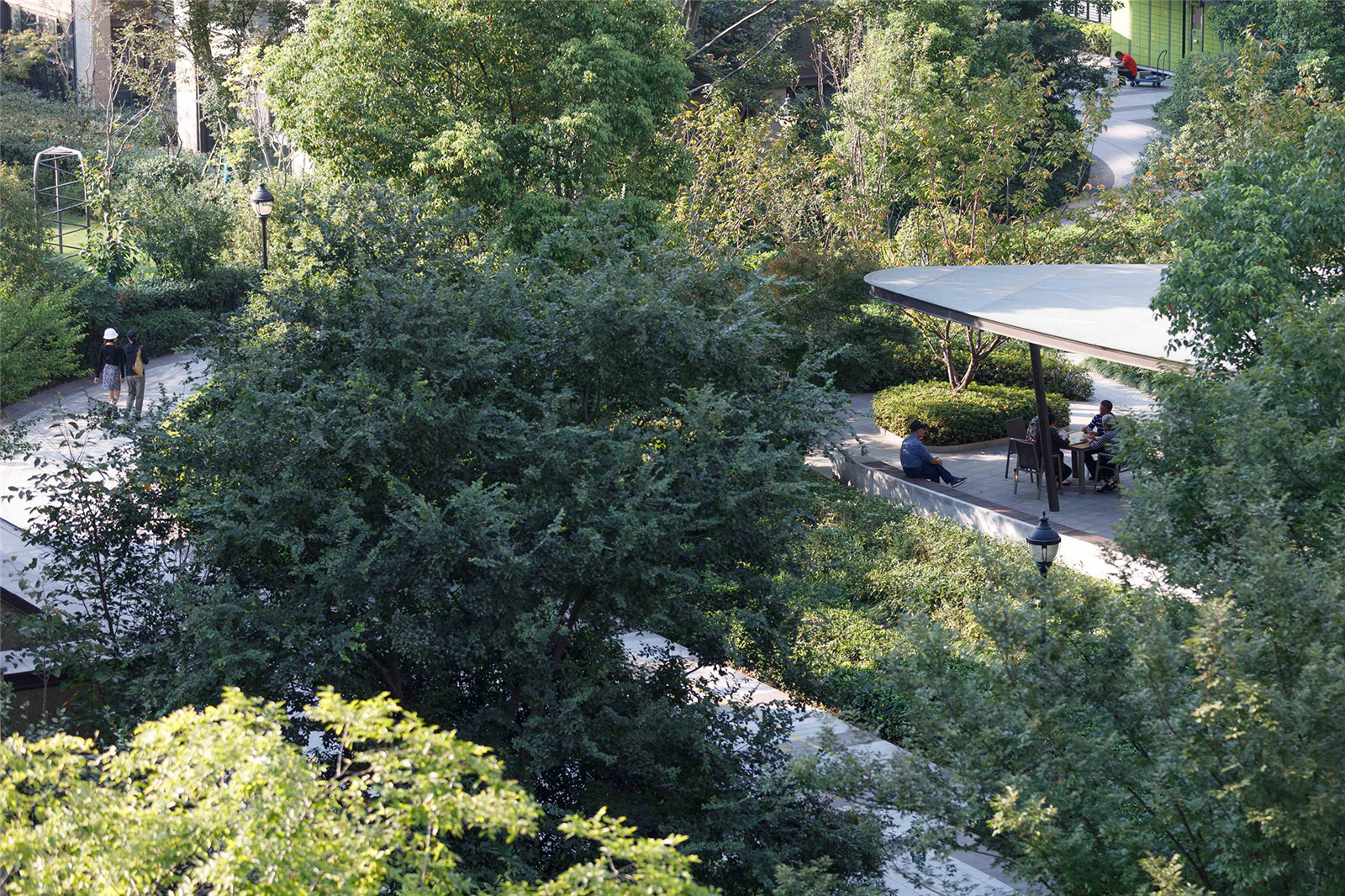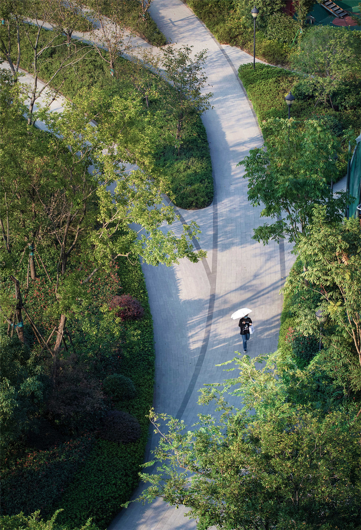 郁郁蔥蔥的蜿蜒步道網(wǎng)絡(luò)穿梭在被中央核心區(qū)分割的兩個(gè)區(qū)域中,連接著多個(gè)鄰里微空間,它們在更小的尺度上容納各種活動(dòng),促進(jìn)社區(qū)參與。南部和北部的社區(qū)中均設(shè)計(jì)了主題花園,為健康的社區(qū)環(huán)境奠定了基礎(chǔ)。在設(shè)有涼亭的臺(tái)地周圍,層次分明的植物配植讓杭州獨(dú)特的園林和茶文化在社區(qū)中得以再現(xiàn)。
