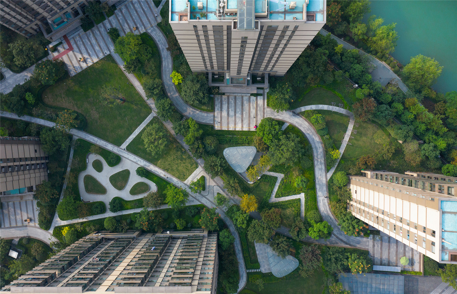 Hangzhou's hills are covered in terraced tea shrubs, a vital element of the region's economy and culture. Using these terraces as inspiration, elevated plazas celebrate local agriculture while providing wide garden views and lush outdoor living rooms.