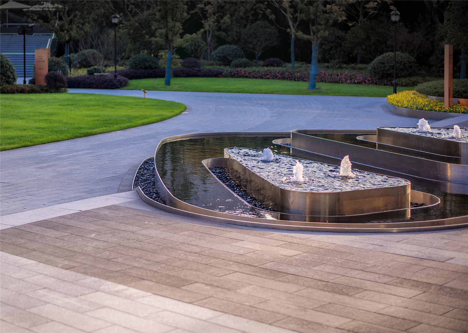 The Central Lawn features an informal amphitheater as a multi-functional activity space that offers programs for groups large and small. The flexibility of long seating walls allows residents to use the space as needed. Visitors can meet, play and exercise utilizing the basketball and tennis courts, the children's playgrounds and the jogging trails that vary in length and difficulty. Core activity can be viewed from a seating nook or a raised lookout platform that also provides wide views of Hangzhou.