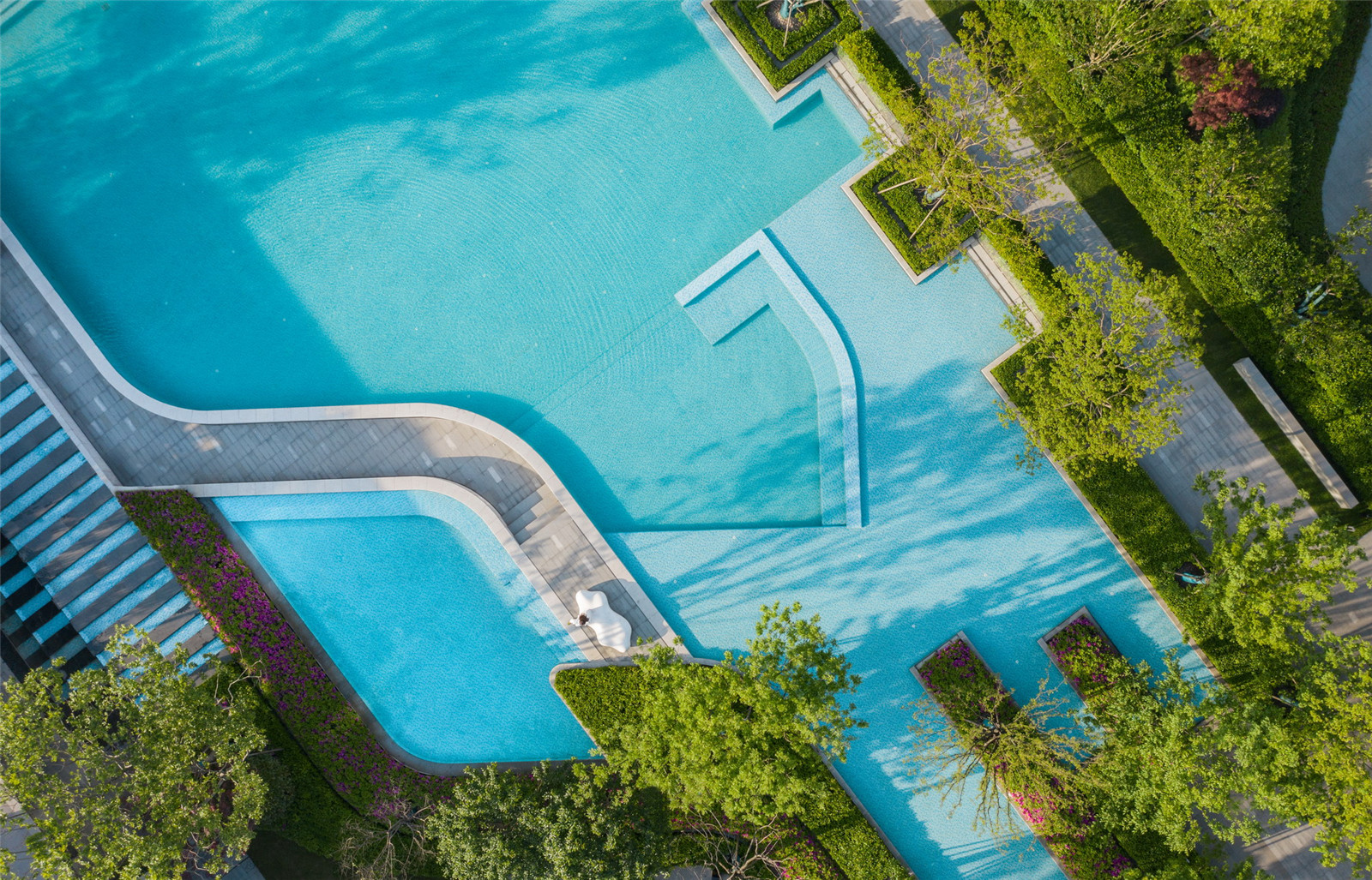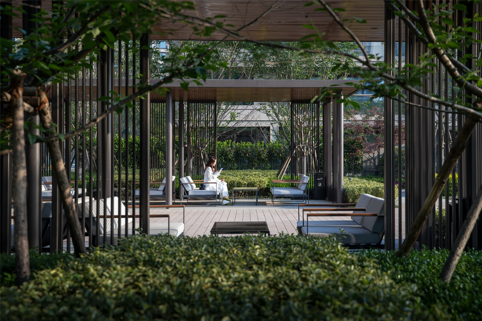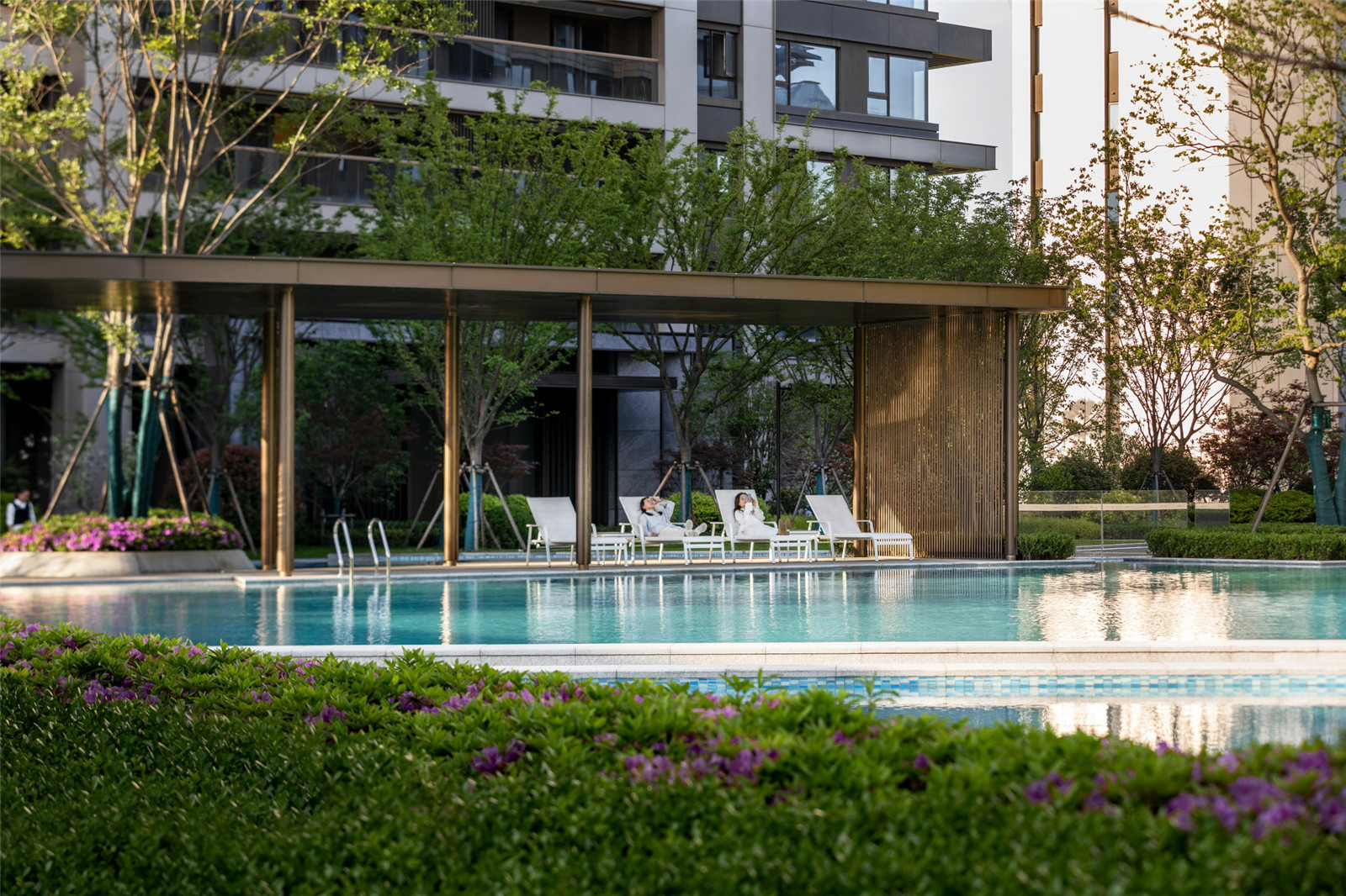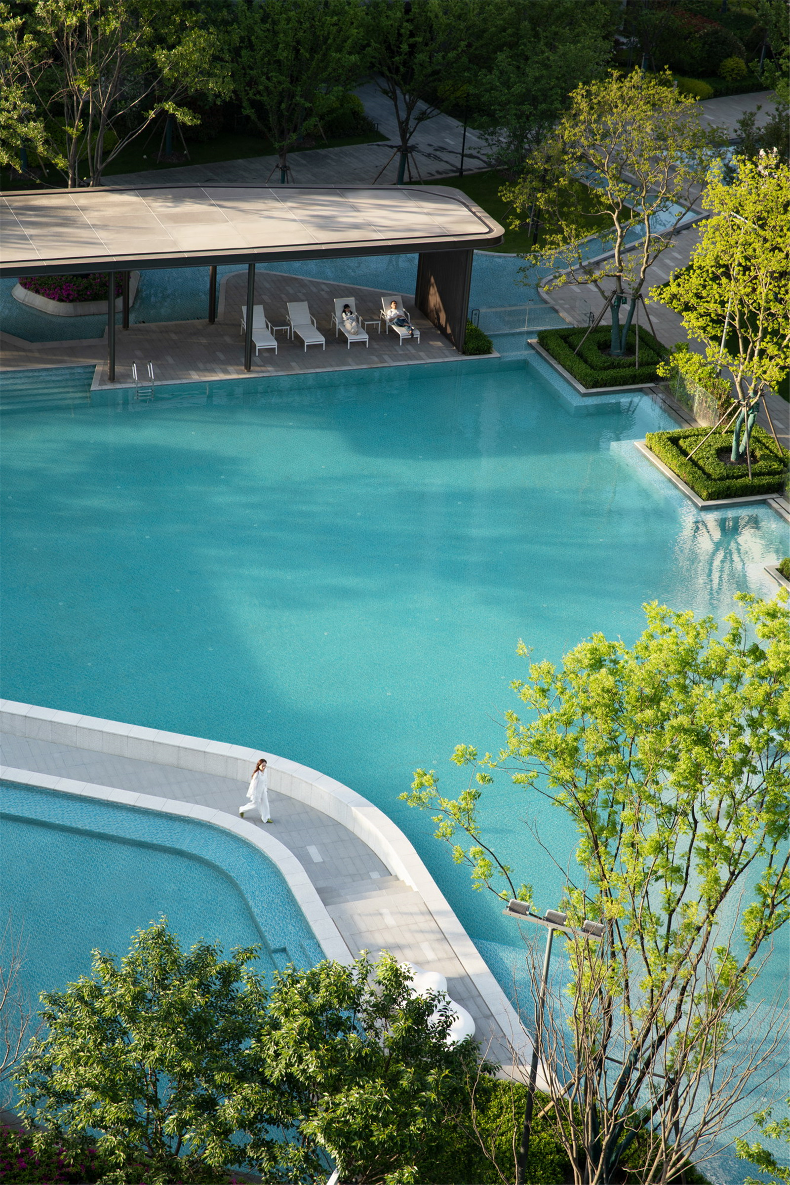 作為戶外客廳的景觀廊架居于大水景端景處,形成空間的視覺焦點(diǎn),配置的白色躺椅帶來度假風(fēng)的悠閑體驗(yàn),開闊視野將池上風(fēng)景一覽無遺。