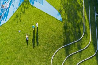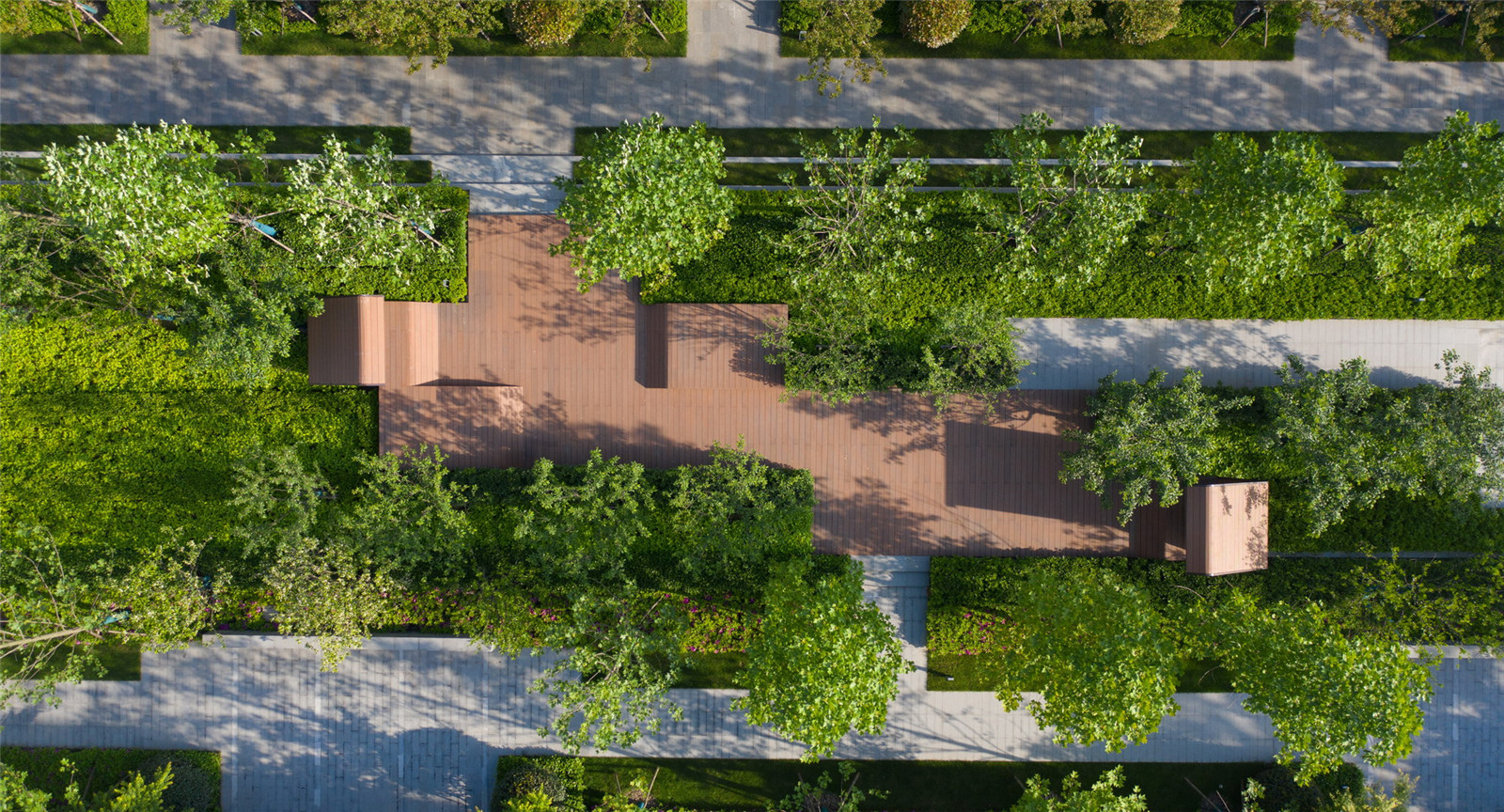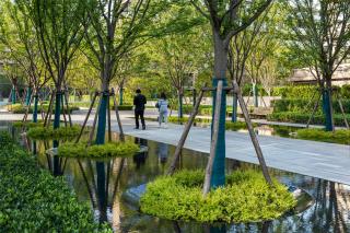 大道兩旁配置了木質(zhì)的公園椅,方便各年齡段人群以閑談、閱讀、放空等各種方式來享受這片林下空間。整條大道動(dòng)靜相宜,互相可見可達(dá),但在水系景觀的阻攔下不會(huì)打擾對(duì)方。