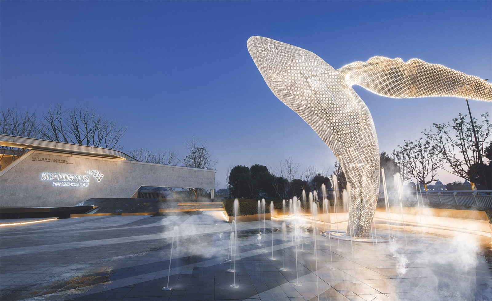 水景中連綿起伏的線條感,取自錢塘江的流水,粗細(xì)緩急,時(shí)有活潑的跳泉嬉戲碰撞,宛如江水的涌動(dòng)不息。