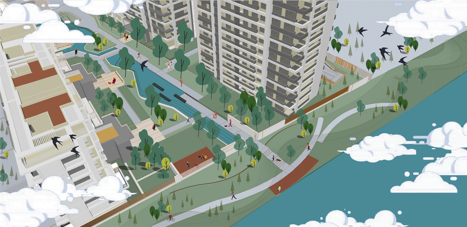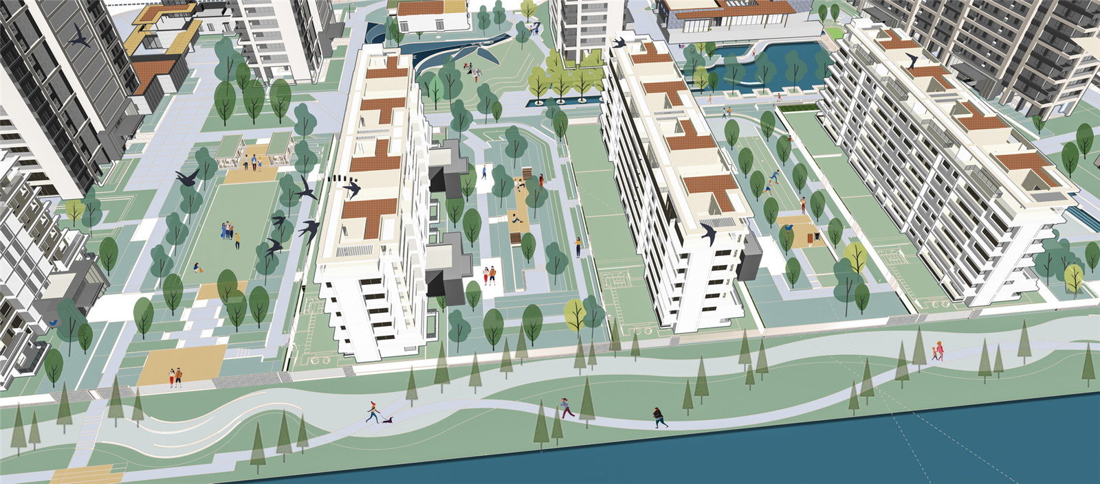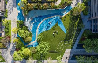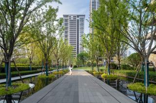 心向自然,臨水而居的生活理念貼合杭州慢生活的特點(diǎn)。景觀自然軸連通著社區(qū)的人工水系與『前灣?沿河綠地』的自然水系,超大水景空間→人工水系→自然水系,形成了城市開放空間視覺上的延續(xù),通過水與綠化的序列,與城市空間產(chǎn)生聯(lián)系。
