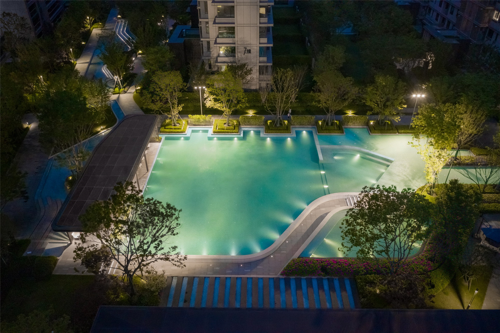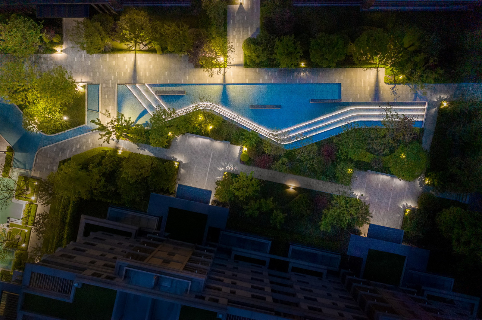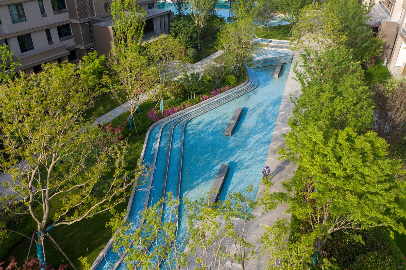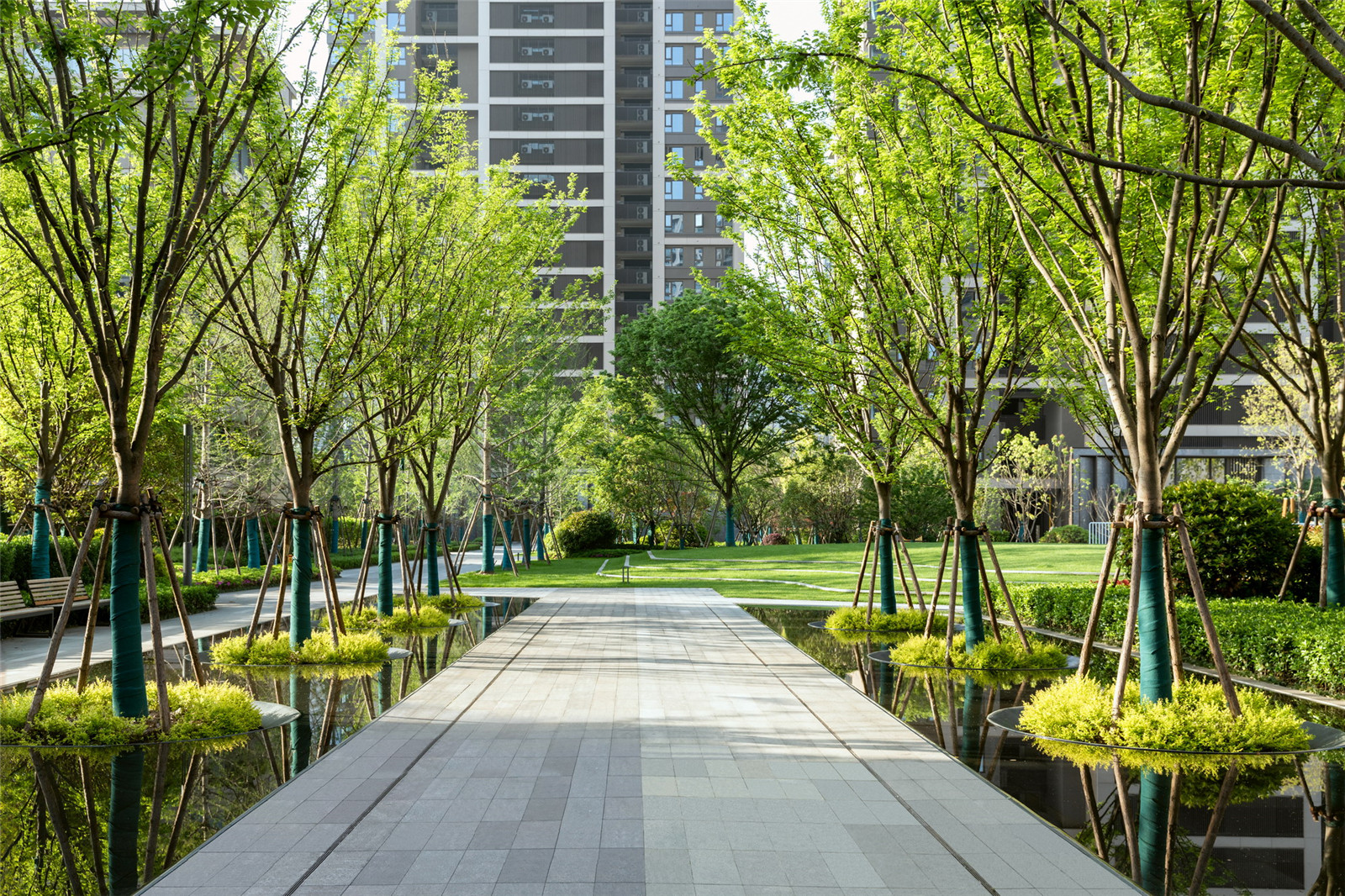 從大水景空間延伸出兩側(cè)觀賞水景,將林蔭大道分為主人行動(dòng)線與小尺度的休憩動(dòng)線,同時(shí)也賦予了這里公園式的休閑氛圍,兩側(cè)設(shè)置休息座椅,營(yíng)造林下歸家、休憩的生活場(chǎng)景。
