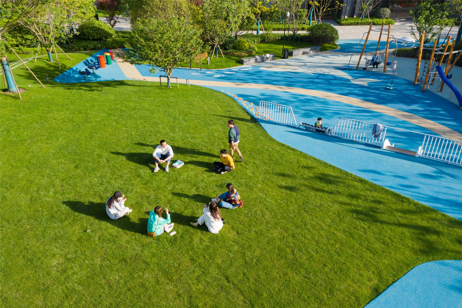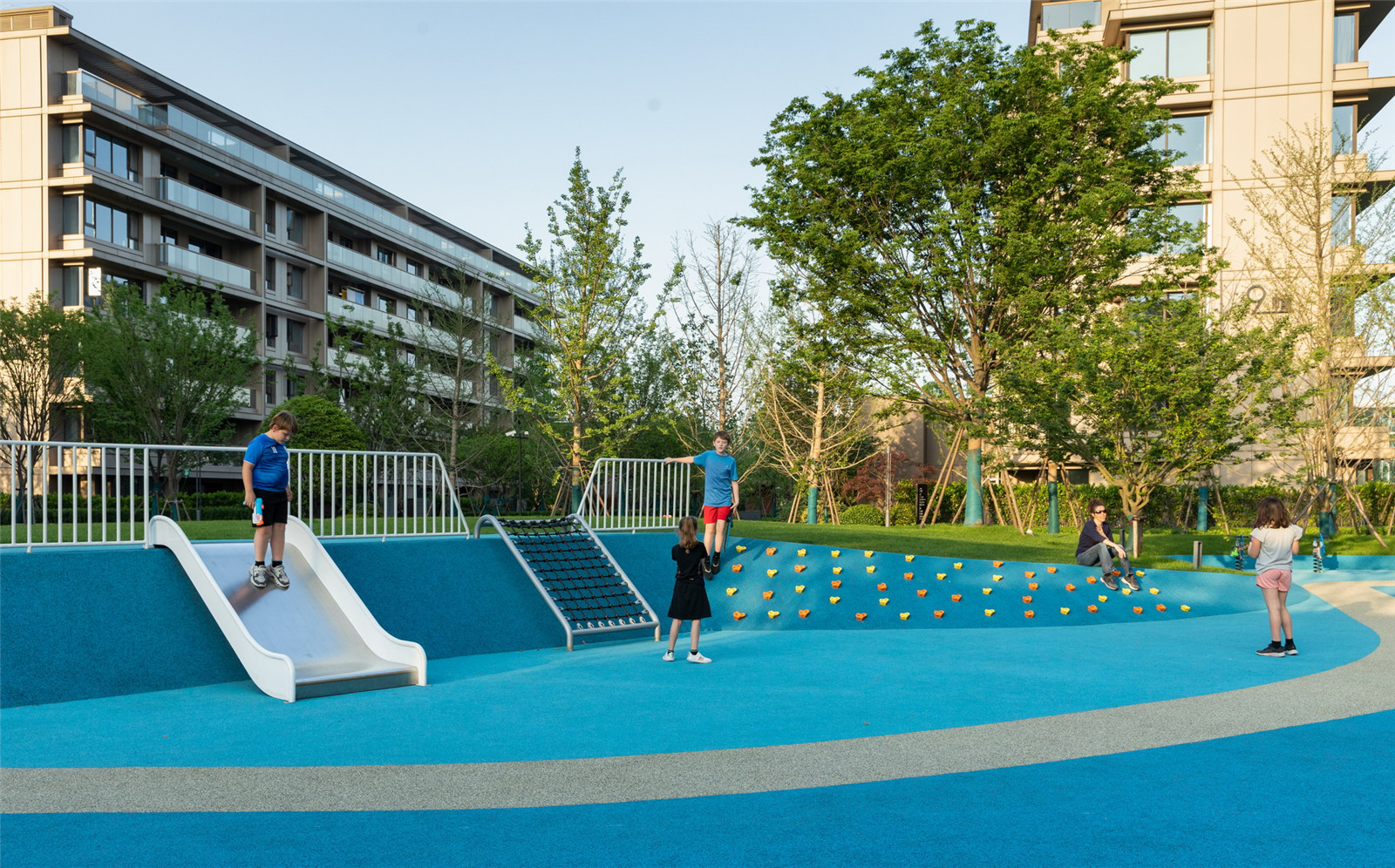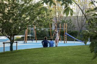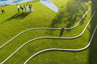 陽(yáng)光草坪緩緩堆疊,形成一個(gè)小小的草坡,向上抬起的地勢(shì)引導(dǎo)視線的跟隨,為活動(dòng)場(chǎng)地形成了圍合的空間。這里就是一個(gè)開放的“公園”,無論是踩、坐、跑、躺,在柔軟草地的包容下,都能安全、輕松的進(jìn)行。