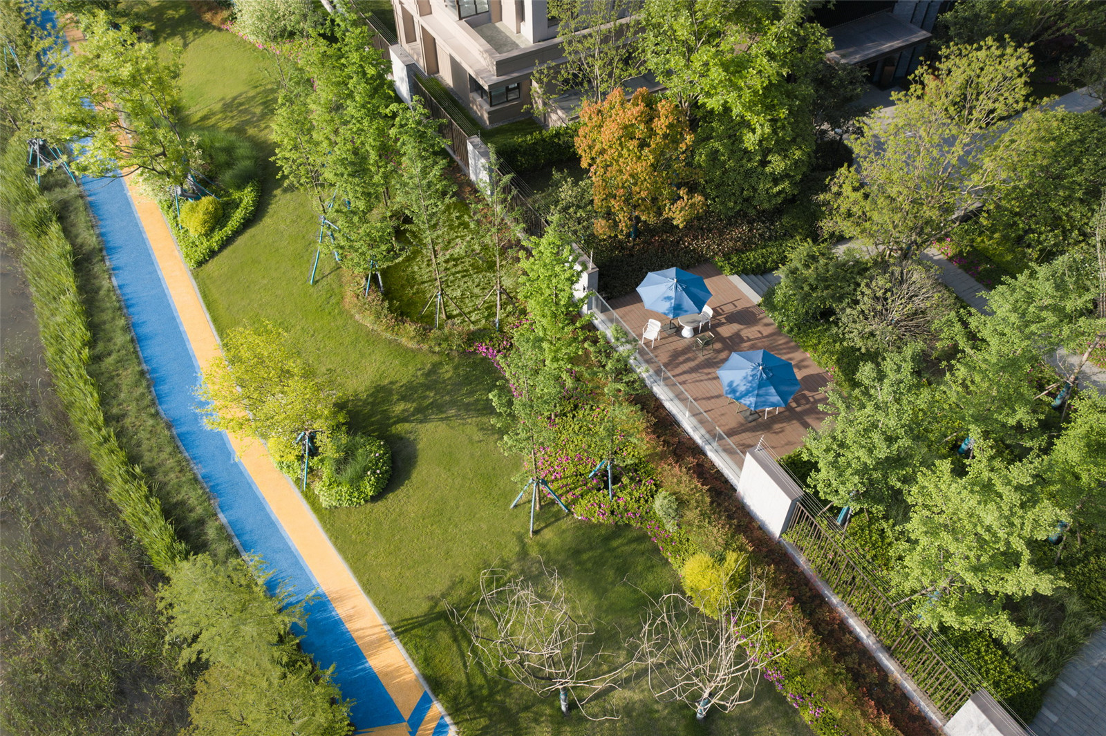 除了上述自然景觀軸上的沿“江”花園,社區(qū)內(nèi)還劃分了3個(gè)不同功能的宅間花園,為居住者們提供更多戶外場(chǎng)景的展開空間。