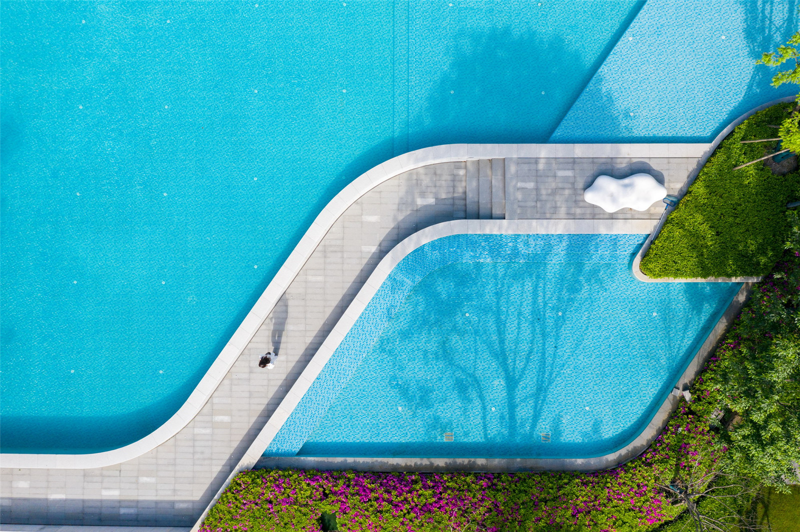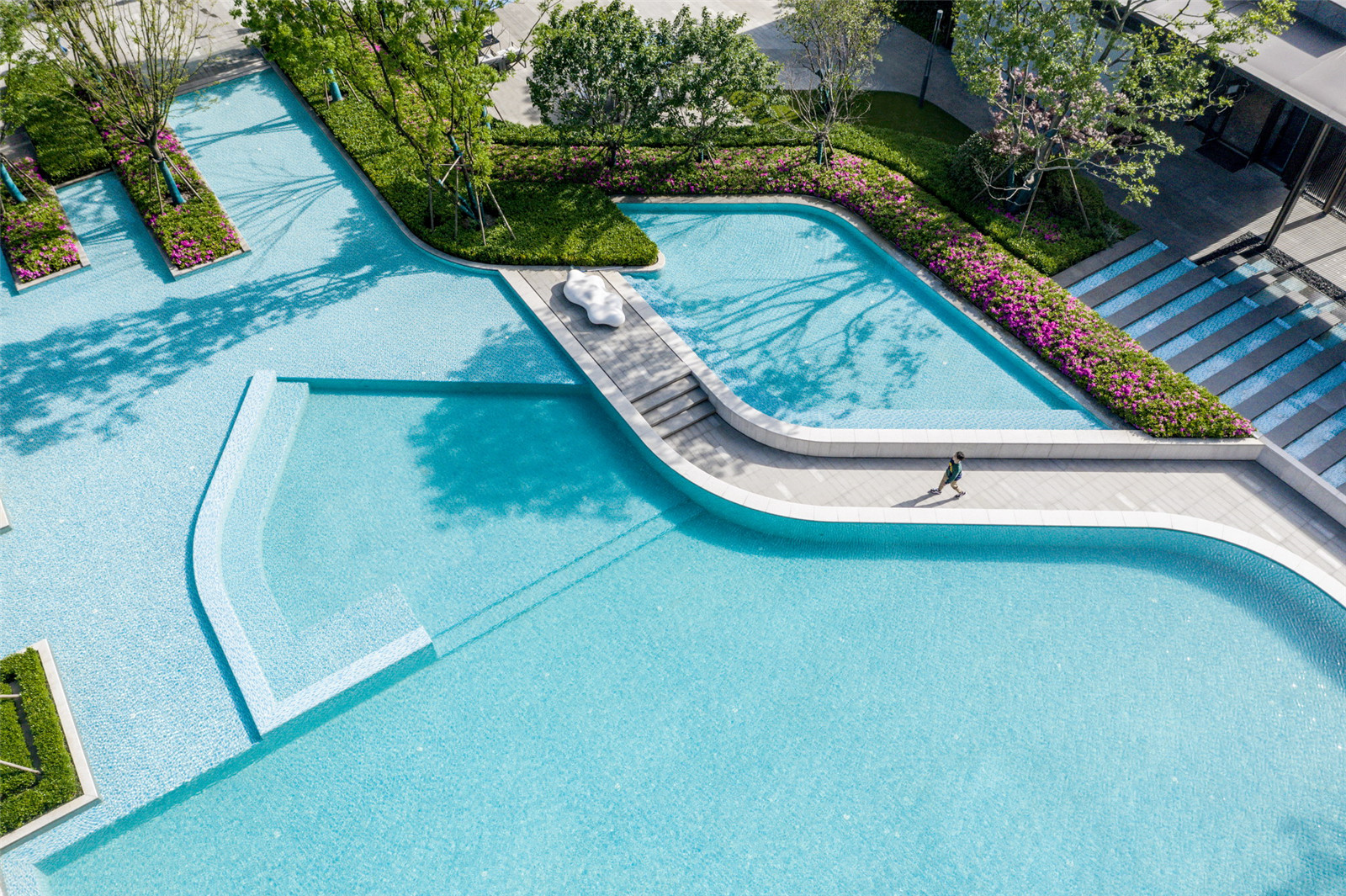 720㎡的超大水景空間劃分出了不同的功能區(qū)域:景觀廊架休閑區(qū)、云影小道、云上觀景臺(tái)、親水平臺(tái)、戲水空間等,滿足不同人群的親水需求。