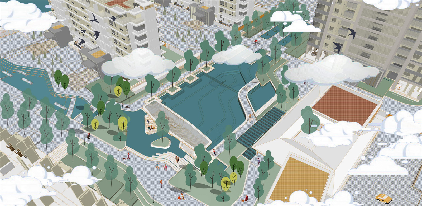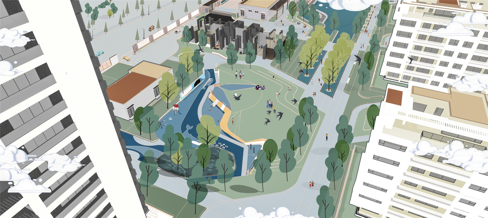 景觀生活軸是一條“熱鬧”的景觀軸線,隨處都可以找到樂子,氛圍歡快卻能鬧中取靜,一群人or一個(gè)人,都能找到愉悅的生活方式。