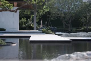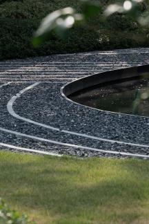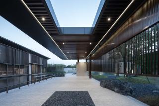 信步轉(zhuǎn)場之間,由山野歸林間,是一方返璞歸真的自然禪境,開闊的綠野有悠閑的雕塑,似踱步于浮洲,如停駐于綠波,寫意舒朗的自然景觀通過景窗、轉(zhuǎn)角、格柵變幻出更多的層次和感受,且將這份適意融入眼前的自然風(fēng)物中,隨心去暢游。