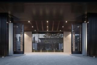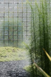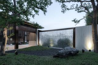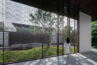當(dāng)踏近展區(qū)入口,端莊典雅的門堂極具儀式感,簡約中式的格柵,似紗如縵,輕籠遠(yuǎn)山,內(nèi)庭的綠意婆娑朦朧可見,隔柵望山,款款而行,優(yōu)雅間步步生禪意。