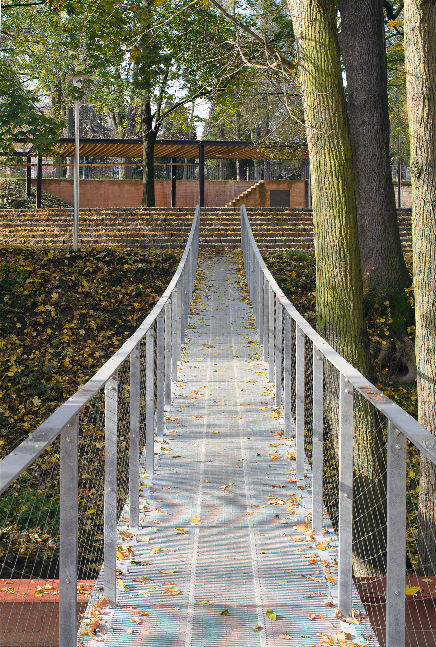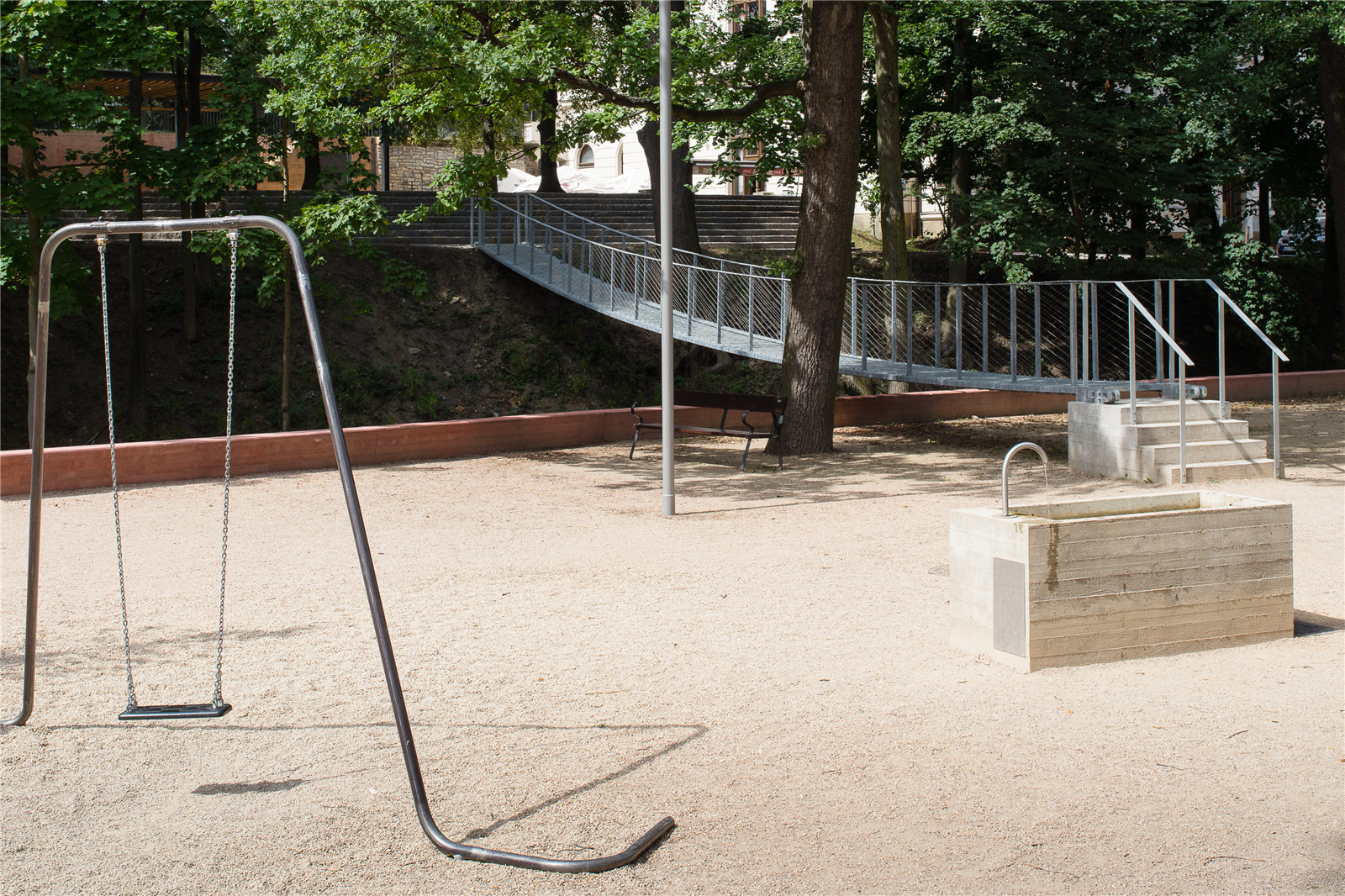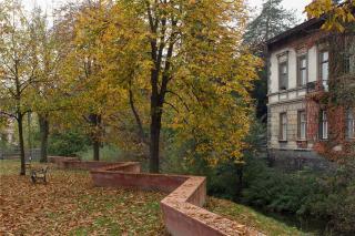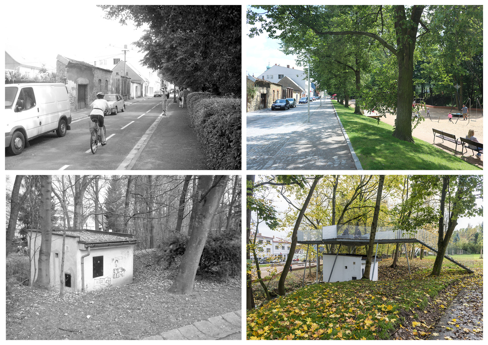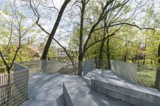 On the embankment there is a city promenade under the trees, designed for rest, meetings and games. It features a sculptured playground with musical motifs. The waterfront is lined with a low wall of colored concrete, creating a border between the city and the natural banks of the river. They are preserved in their wildness and accessible only in selected places by light steel observation platforms. The river Lou?ná is bordered by a hinged footbridge. This is, like the observation platform, designed as a transparent steel structure that is as filigrane as possible. The park at a nearby 19th century concert hall is set on a sunny meadow. Restored is the resting garden of the restaurant, which is newly supplemented by a steel pavilion with a green roof. A narrow street along the edge of the city was re-paved and flattened to transform it into apedestrian zone.