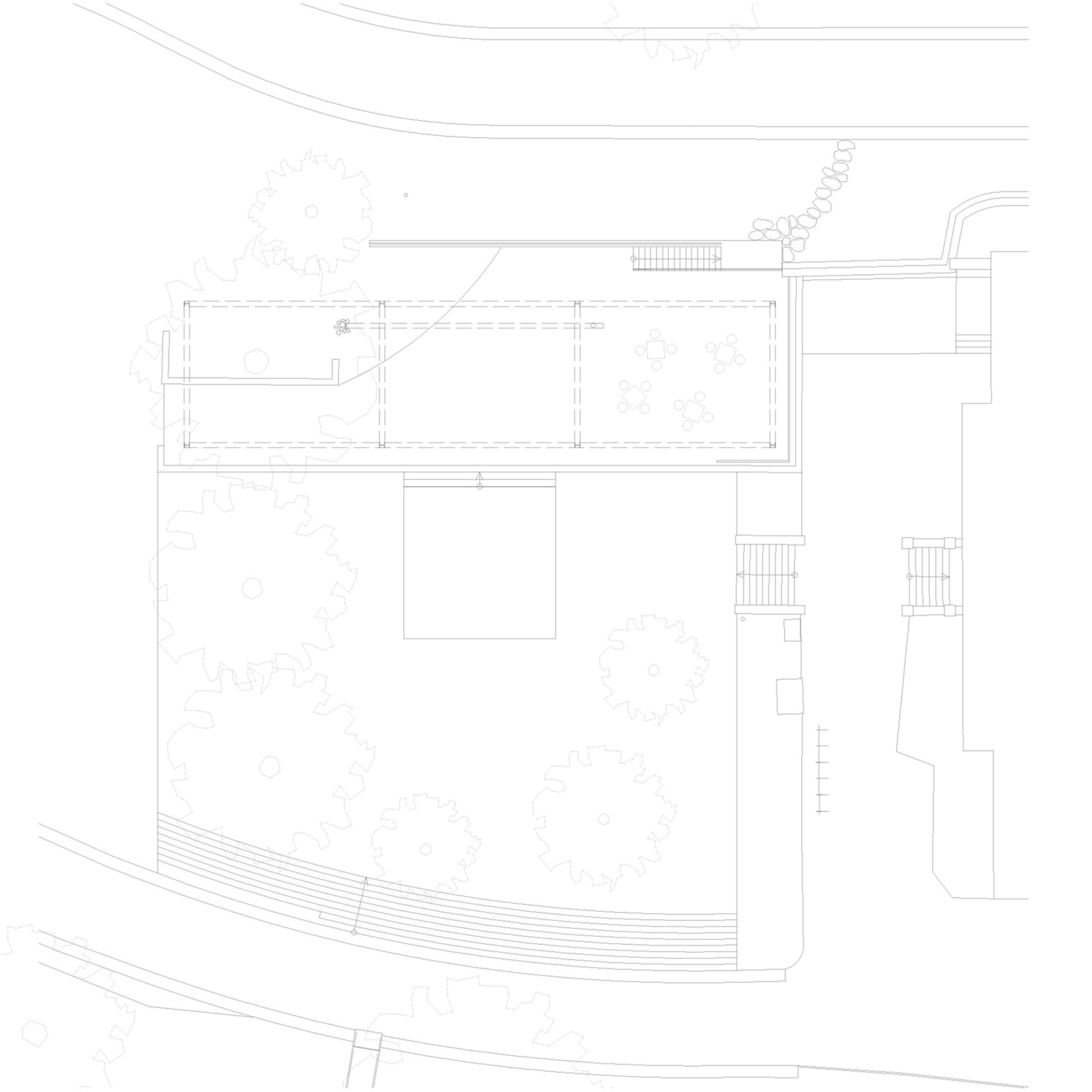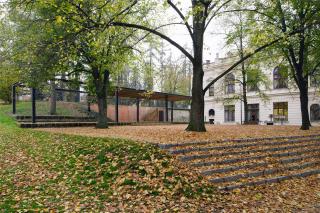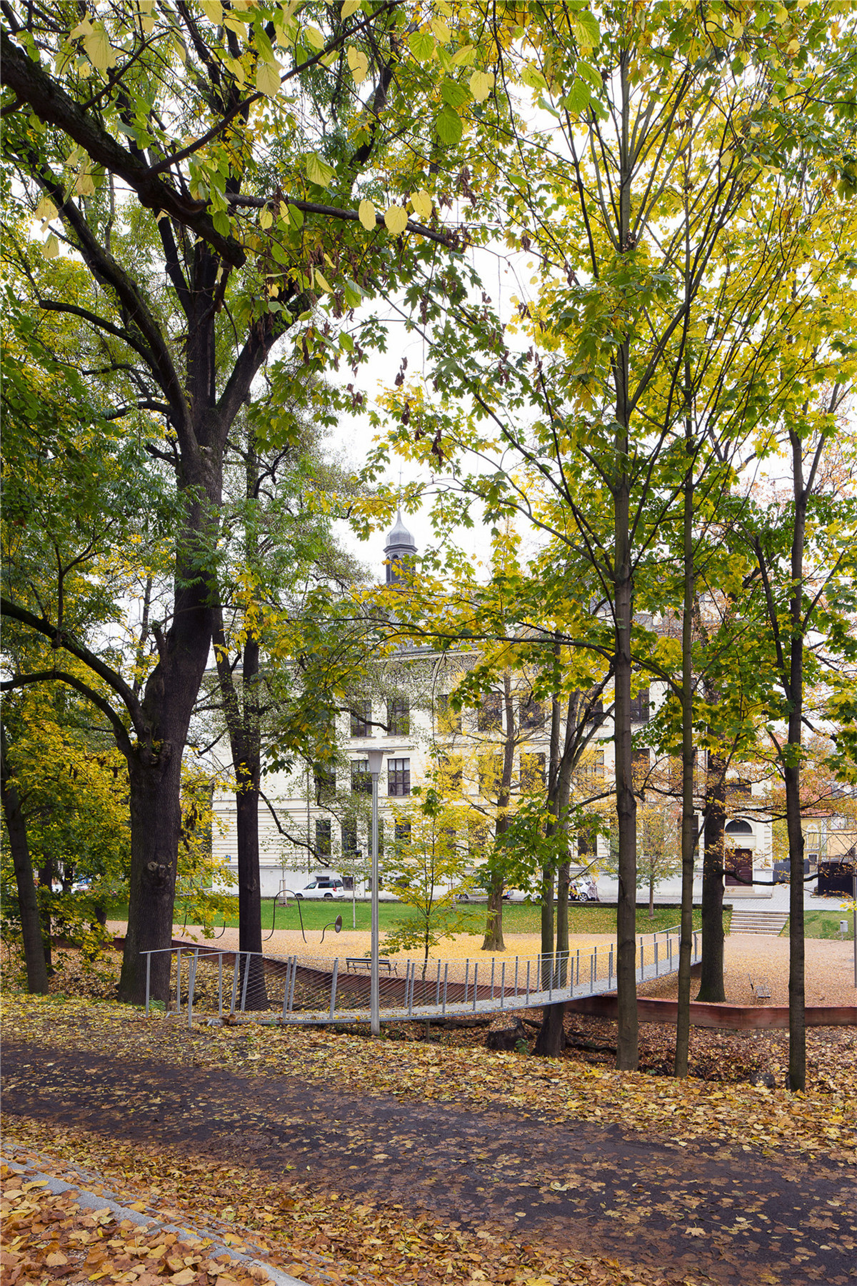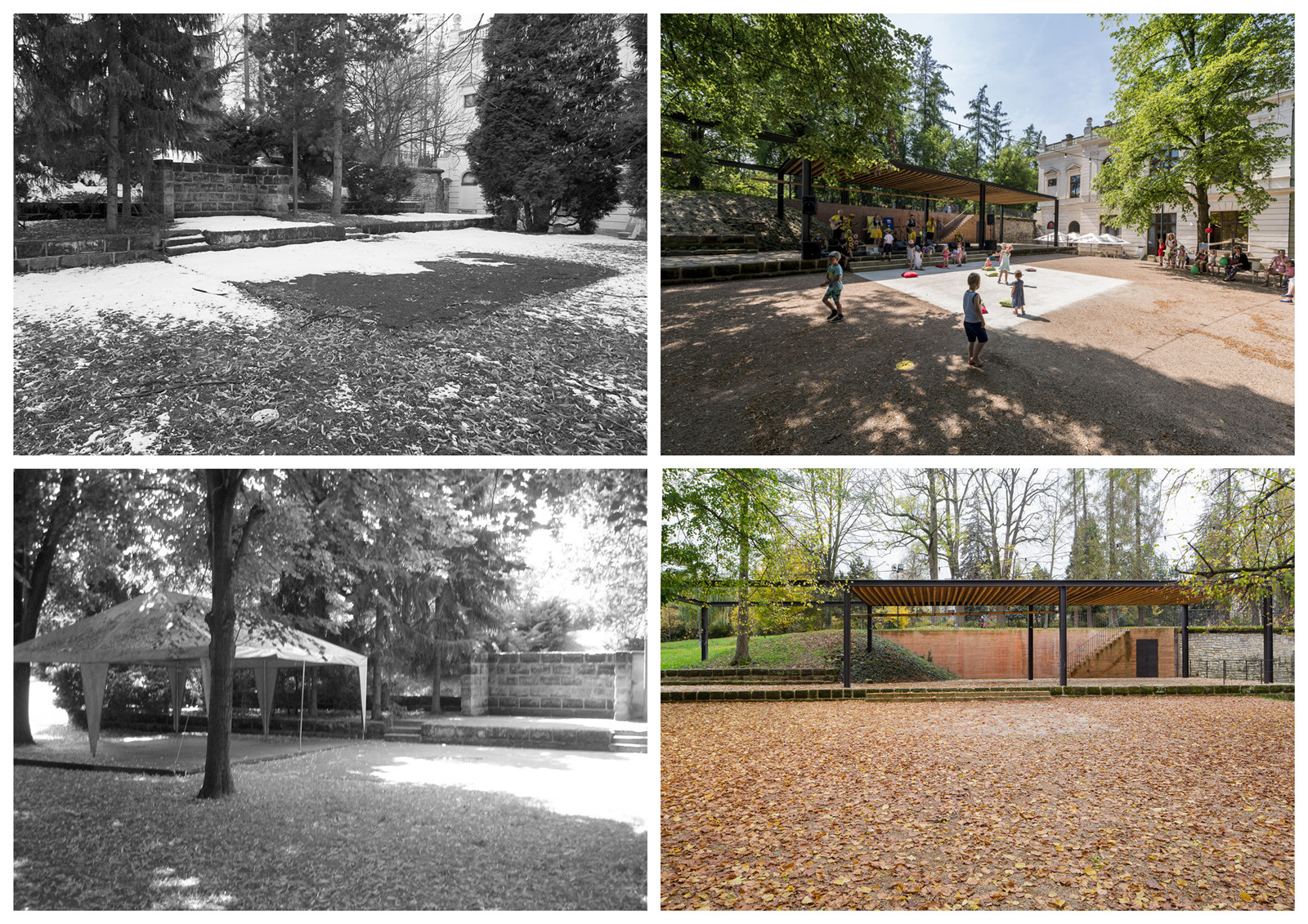 On the embankment there is a city promenade under the trees, designed for rest, meetings and games. It features a sculptured playground with musical motifs. The waterfront is lined with a low wall of colored concrete, creating a border between the city and the natural banks of the river. They are preserved in their wildness and accessible only in selected places by light steel observation platforms. The river Lou?ná is bordered by a hinged footbridge. This is, like the observation platform, designed as a transparent steel structure that is as filigrane as possible. The park at a nearby 19th century concert hall is set on a sunny meadow. Restored is the resting garden of the restaurant, which is newly supplemented by a steel pavilion with a green roof. A narrow street along the edge of the city was re-paved and flattened to transform it into apedestrian zone.