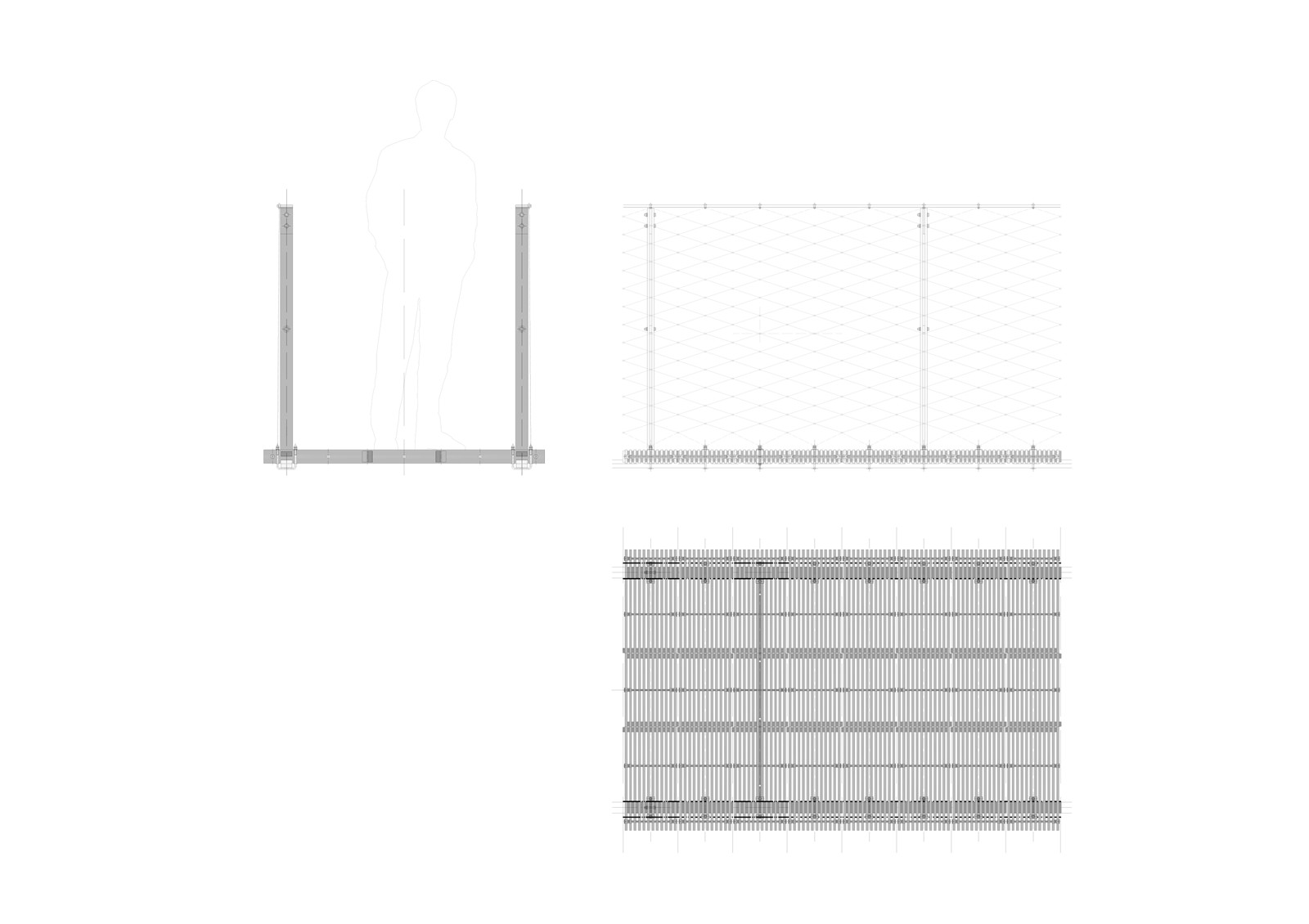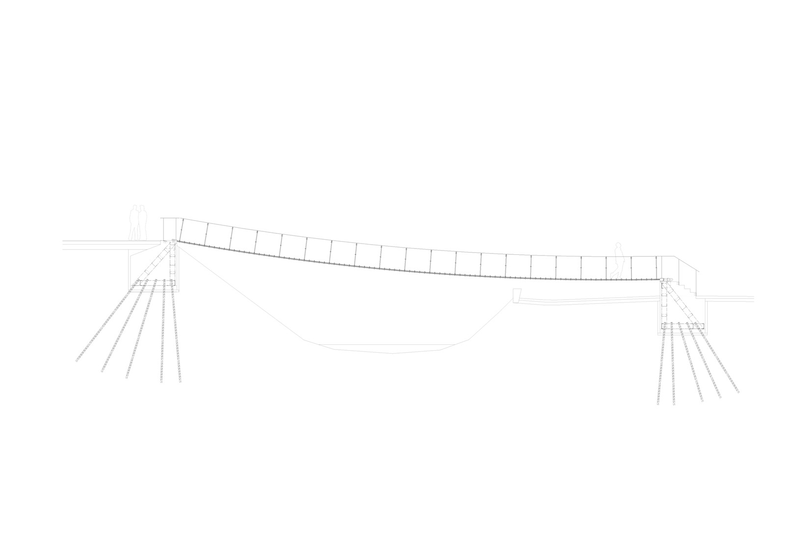 河畔樹林下的城市步道可供人們休息、聚會(huì)和游戲,并配有一個(gè)音樂主題的雕塑游樂場(chǎng)。濱水區(qū)的紅色混凝土矮墻界定了城市與天然河岸的邊緣。設(shè)計(jì)保留了河岸的荒野景觀,僅能通過特定位置的輕鋼觀景平臺(tái)進(jìn)入林間。一座鉸鏈?zhǔn)降娜诵袠驒M跨Lou?ná 河兩岸,采用和觀景臺(tái)一樣纖細(xì)通透的鋼結(jié)構(gòu)。在19世紀(jì)音樂廳附近設(shè)置了陽光草坪,并修復(fù)了餐廳的休閑花園,添置了一個(gè)帶有綠色屋頂?shù)匿摻Y(jié)構(gòu)涼亭。此外,項(xiàng)目平整了位于城市邊緣的狹窄街道,經(jīng)重新鋪裝后成為舒適的步行區(qū)。