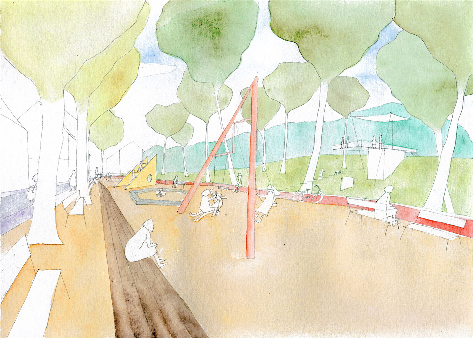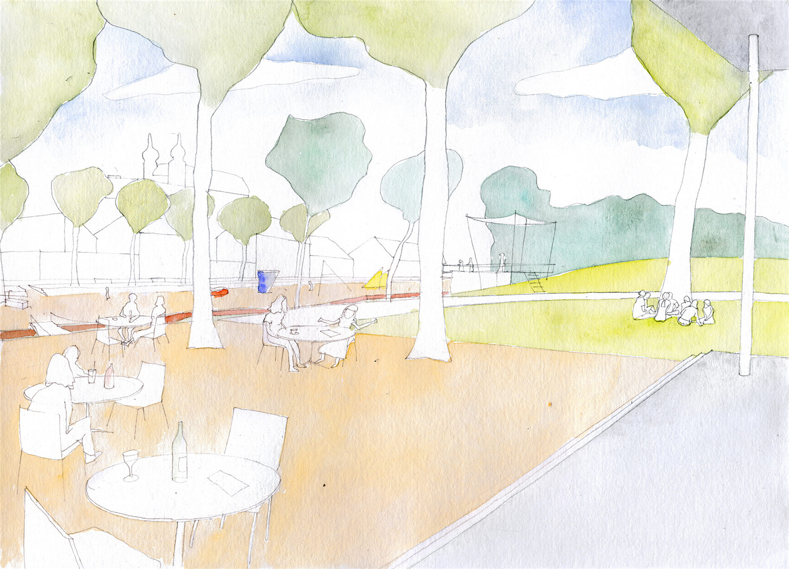 Our design is based on the concept of interconnecting four different urban areas – waterfront, riverside, park and street – into one functional unit.
