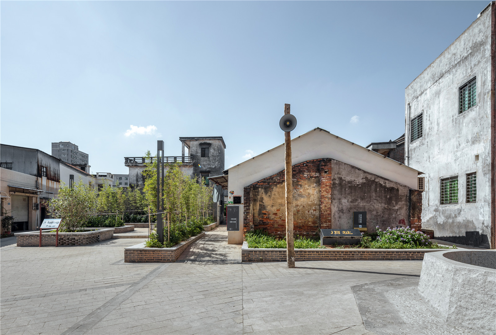 保留場(chǎng)地記憶,結(jié)合原有建筑斷墻及村落老水井作為設(shè)計(jì)要素延展,結(jié)合具有年代記憶感的喇叭點(diǎn)綴,致敬曾經(jīng)的生活場(chǎng)景。