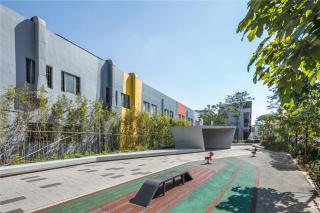 通過拆除違章搭建釋放公共空間,打造集中式的休閑活動(dòng)場(chǎng)地。改造后的工廠區(qū)面貌煥然一新,重點(diǎn)建筑形象通過異形穿孔鋁板及耐候鋼板包裝得以重塑,原有標(biāo)準(zhǔn)廠房以外墻漆刷新的形式煥發(fā)多彩活力,精致的綠化搭配也讓辦公環(huán)境更加生態(tài)自然。