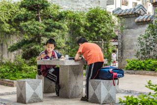 ▼石桌上做作業(yè)的小學(xué)生
