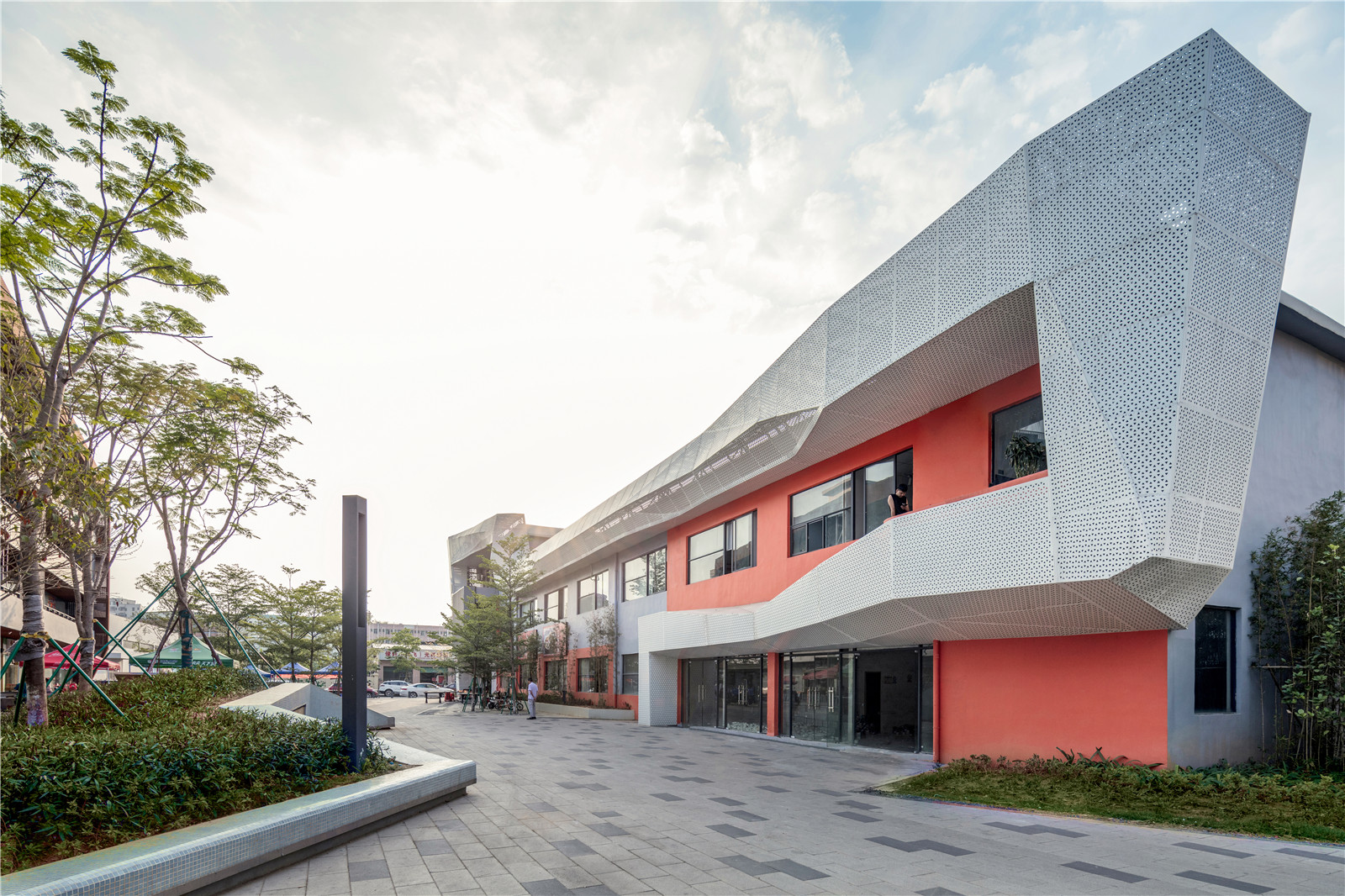 Special-shaped perforated aluminum plate outsourcing factory comprehensive service building, combined with wall refreshing to form a "joint factory" external display image