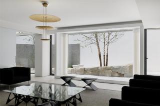 西側的展廳將一樓庭園劃分為兩處巨大而連續(xù)的框景,南側的落地窗則能將整個縱向庭園的幽長盡收眼底。拾級而上或再向上沿窗探看,則另有俯瞰的觀賞視角,空間序列構成了步移景異的效果,兩處庭園隔而不斷。