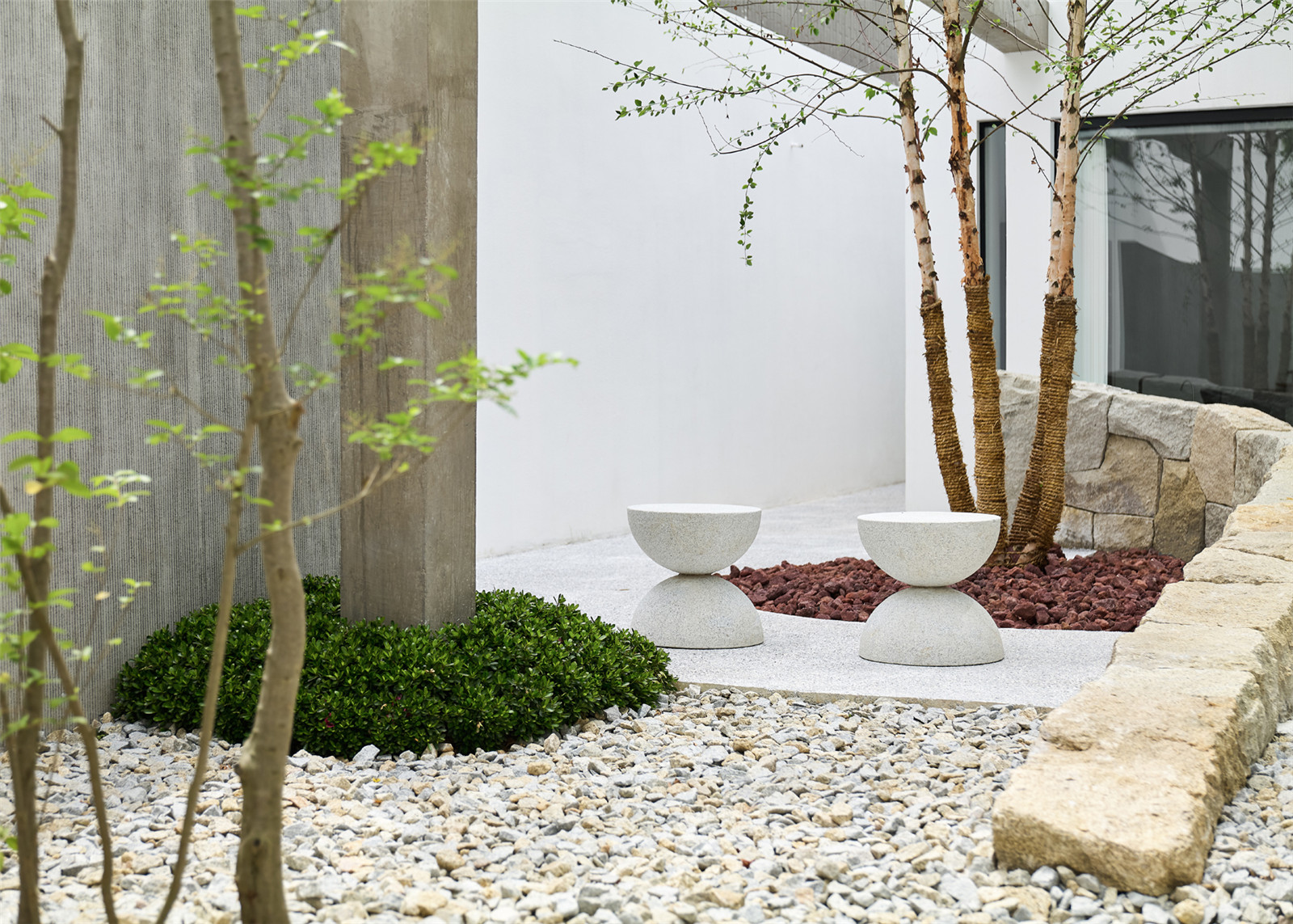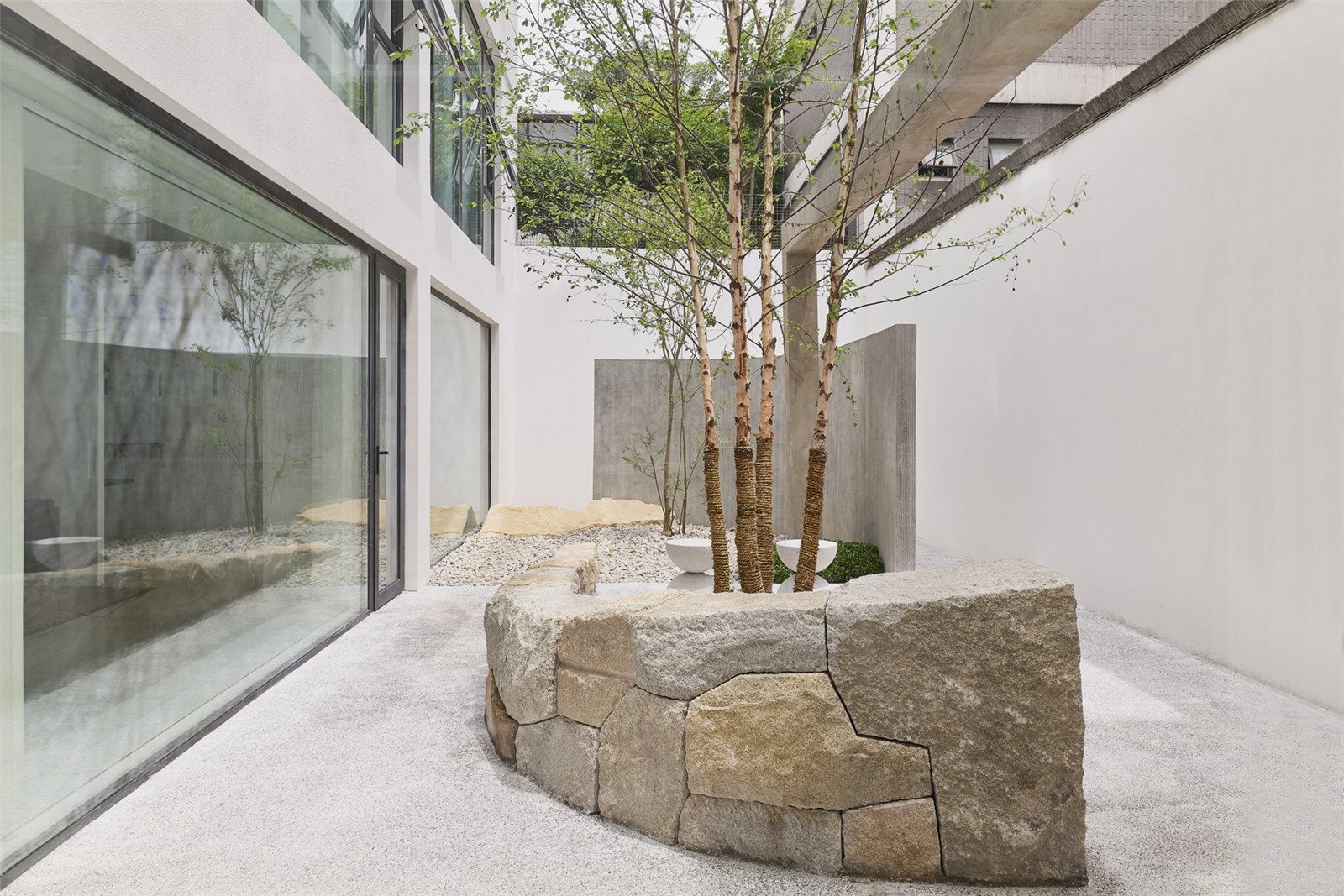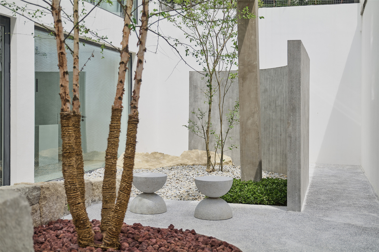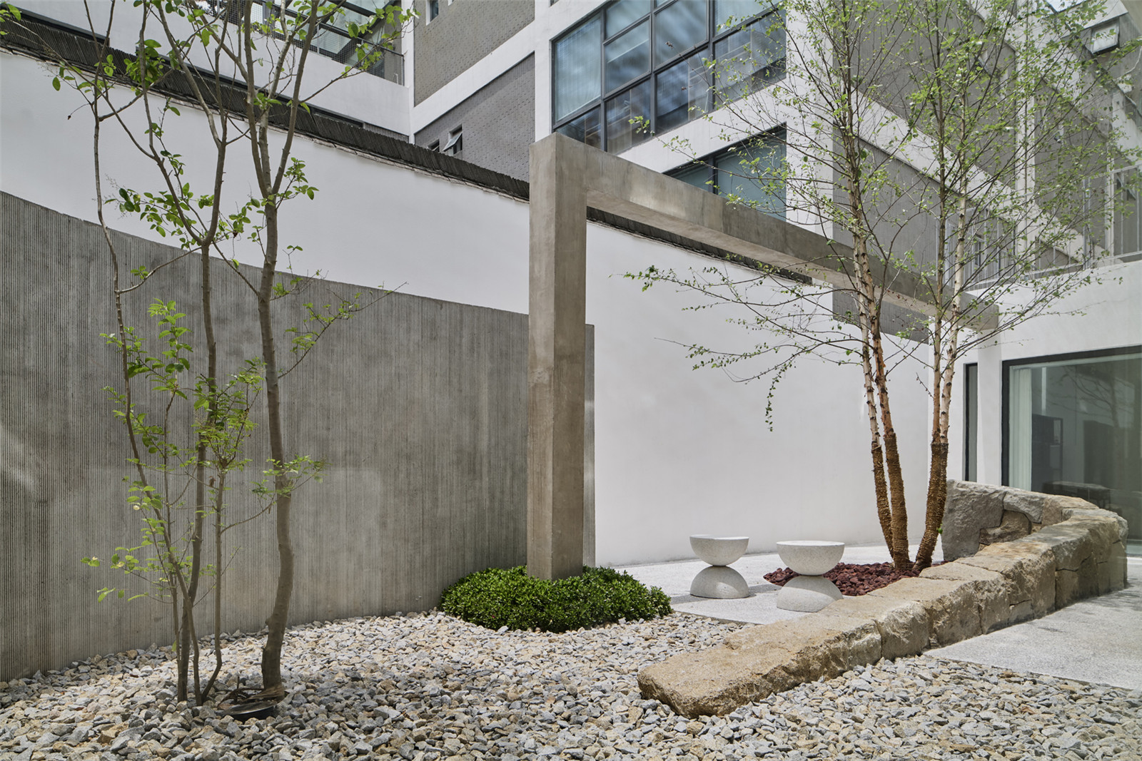 The circulation of garden allows an instance for people to take a pulse and rest. Betula nigra and Ligustrum quihoui carr. are selected for their elegant and smooth branches. The walls, ground, volcanic rocks and benches all together to outline the shadows.