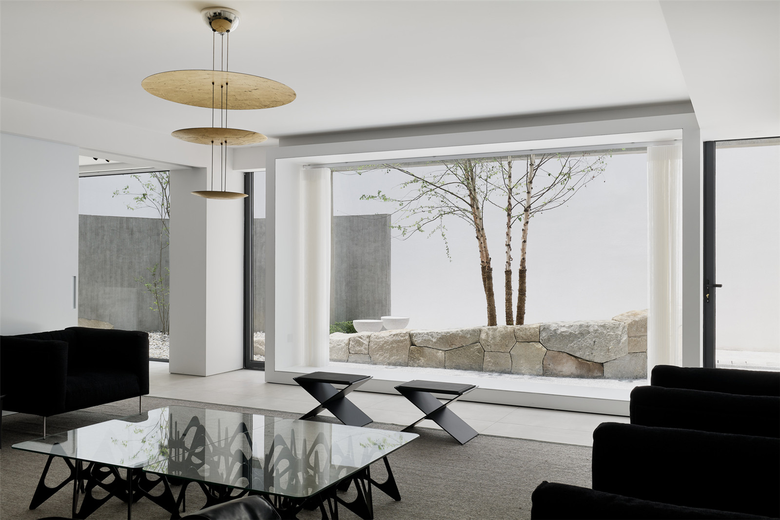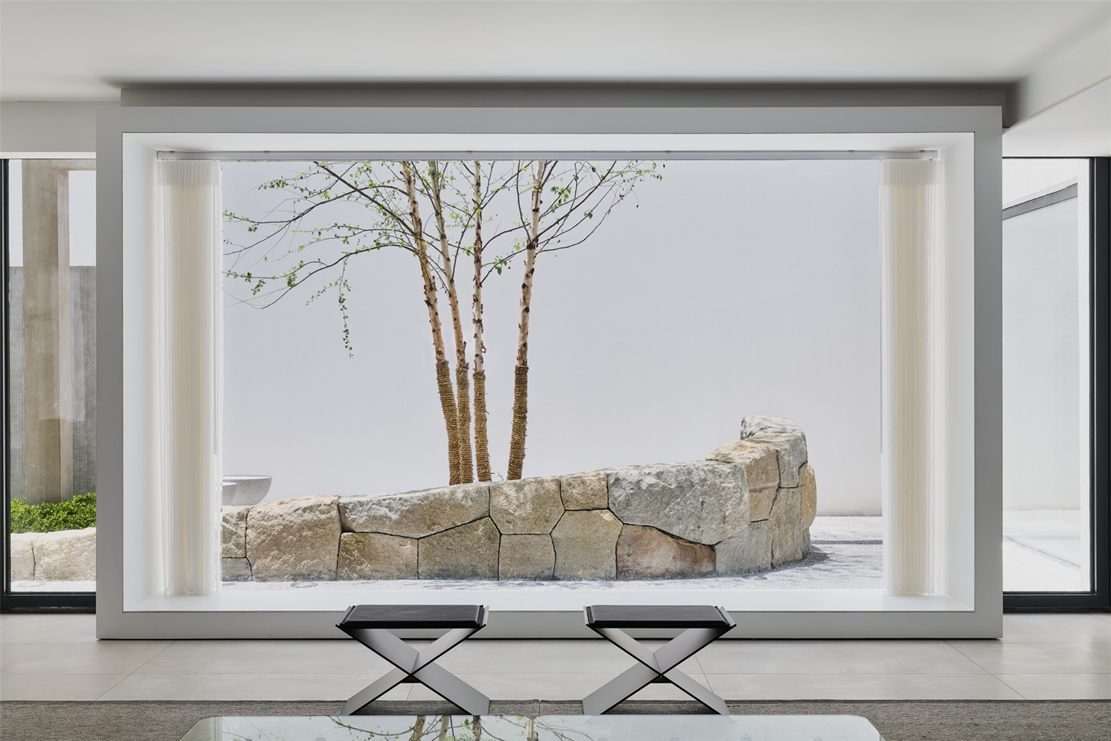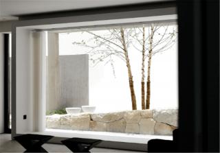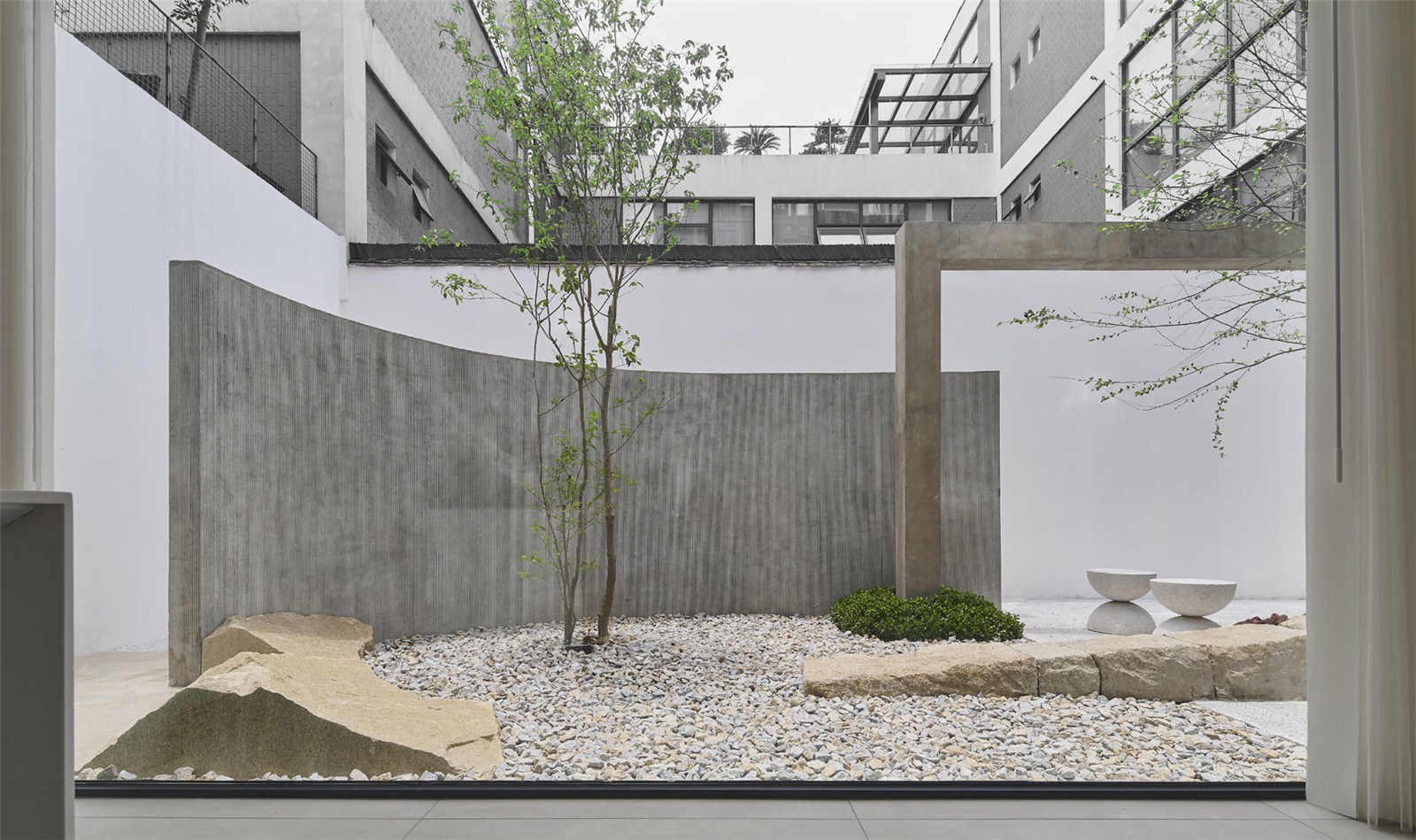 The circulation of garden allows an instance for people to take a pulse and rest. Betula nigra and Ligustrum quihoui carr. are selected for their elegant and smooth branches. The walls, ground, volcanic rocks and benches all together to outline the shadows.