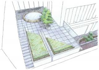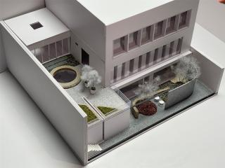 The triangular geometrical shape possesses a sculptural vibrancy. The slant side of the triangle increases the perspective depth. While guiding the visitors into the space, abstract visual sense gradually diminishes. Looking down from the railing, the triangular patio links well with the ground-floor garden.