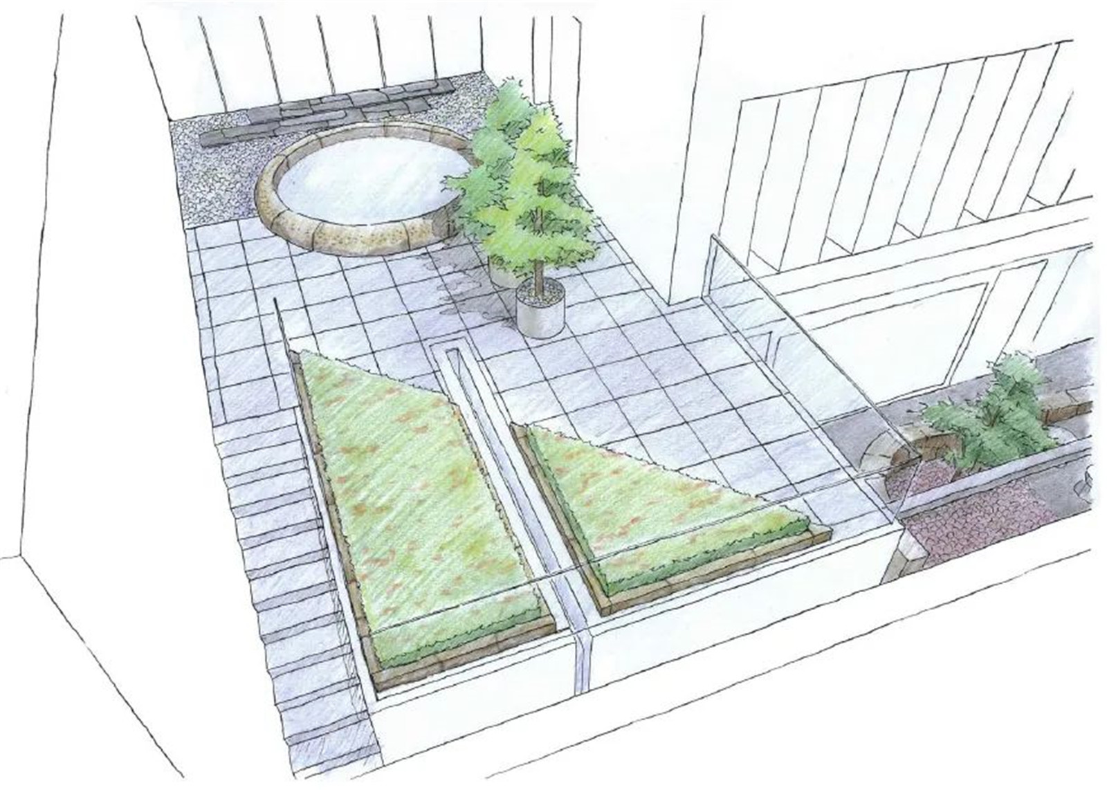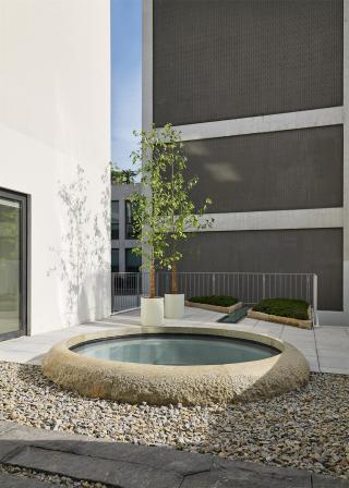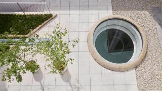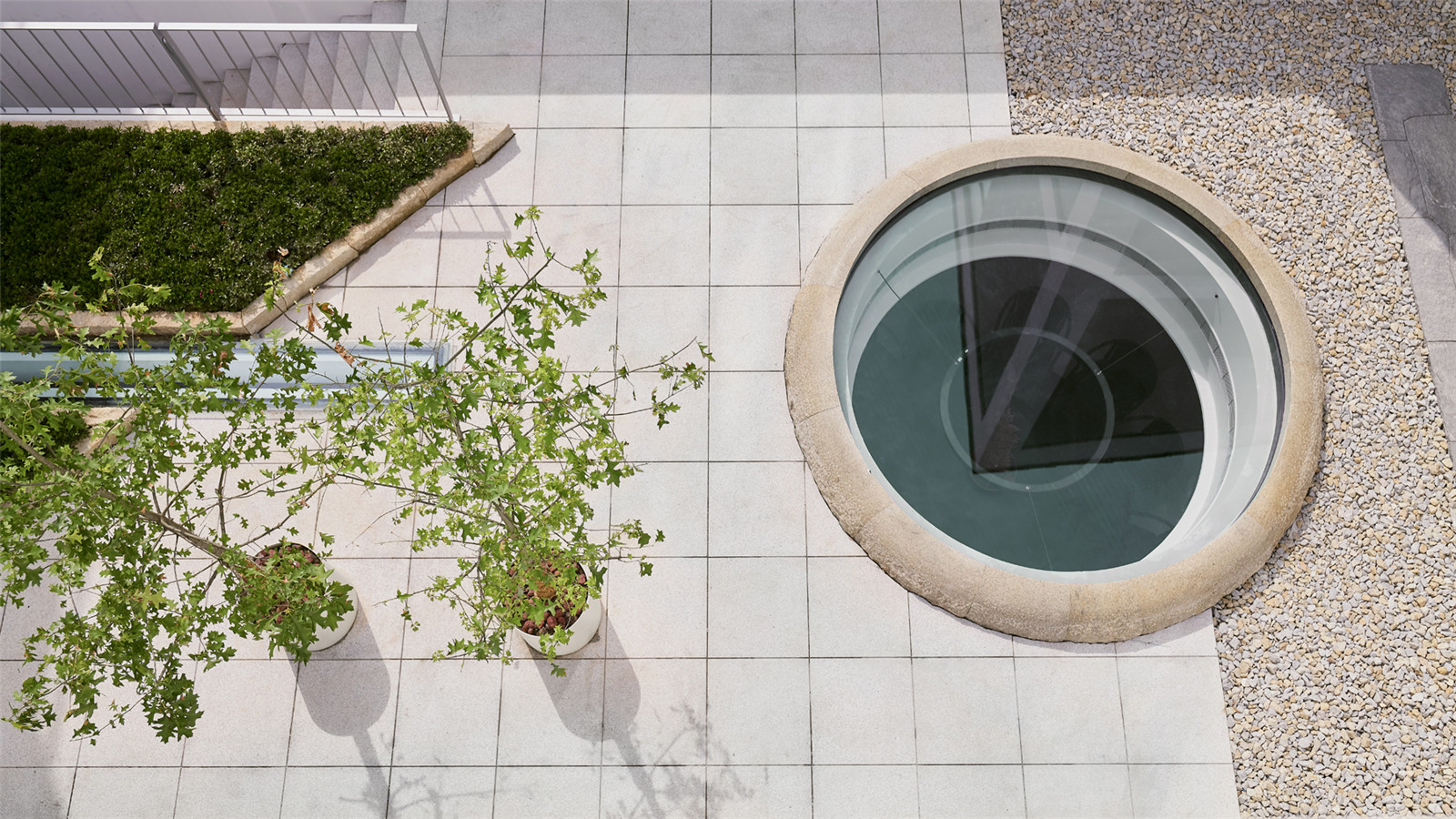 連接辦公室的石材碎拼方形踏步,輔以碎石,增添私密性。三角花壇的種植以灌木矮婆鵑為主,營造肌理。由于承重有限,需采用輕量化設計。圓形采光井包邊石材掏空后做結構支撐,表面處理從自然面過渡至點鑿面再到光面。