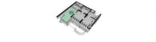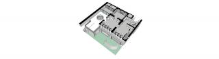 Office room will face the patio; the entire space opens wide with a circular shaped glass window at the center to invite natural lighting, which will further enhance the connection between outdoor landscape and indoor breathing.