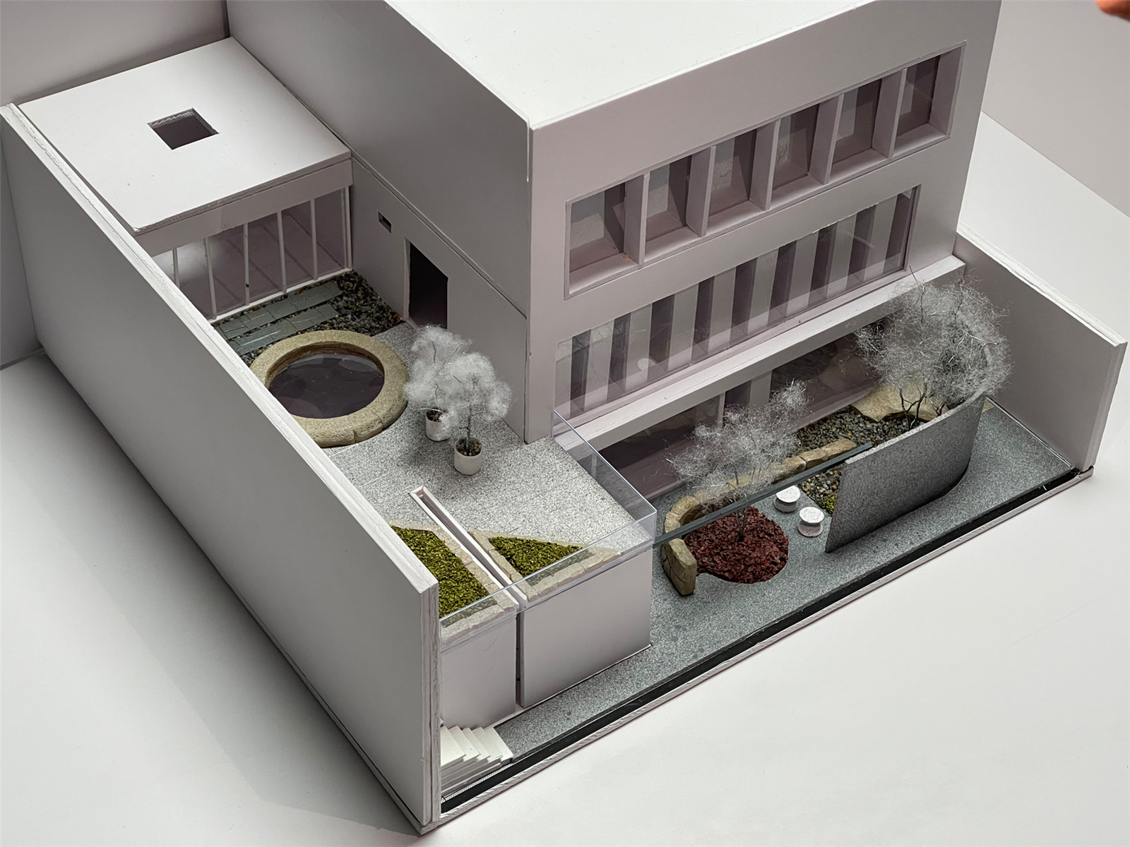 Hallway that connects the office is free form cladding with square shaped steeping stones and gravels, giving a sense of privacy. Rhododendron simsii planch. is the major breed in the triangular flower container, creating a taste of texture. Since the restriction of load-bearing, lightweight materials are the best option to design. The circular glass window edging clad material is hollowed out to serve as a prop to the structure. The surface finishing transitions from natural faced to pointing chiseled then polished.