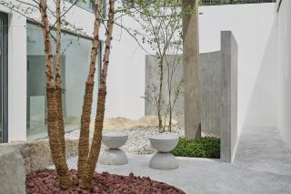 項目位于寧波某創(chuàng)新園區(qū)內一棟五層樓白色建筑內,作為照明公司的展廳與辦公室,一樓的開放式庭園通過轉角階梯連接至二樓露臺。庭園在擁有天光云影的同時,由于建筑本身極富幾何秩序,以及室內爽利簡潔的線條為庭園設計提供靈感,將空間氛圍延續(xù)。