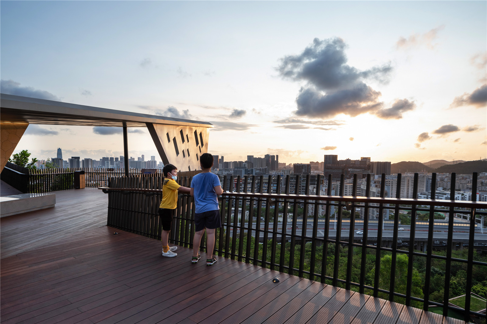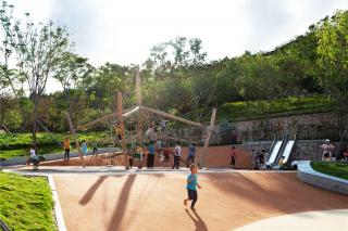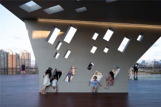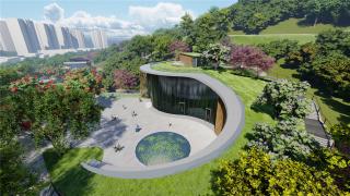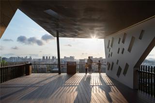 At the middle of and at the mid-level of the park, the lawn area is the only flat area that can be used as the central activity zone for the park. The glass cantilevered lookout platform sitting near the peak and above the Sunshine Lawn. Planting on the rockery slope composed to reveal the character of a mountain park. The facilities architecture is designed in layers to integrate with the natural landform, and the green roofs form a special feature to the park scenery. However, the layering of the building roofs allow natural light to the interior of the building, reduce the use of electricity and maintain a balance in ecological protection.