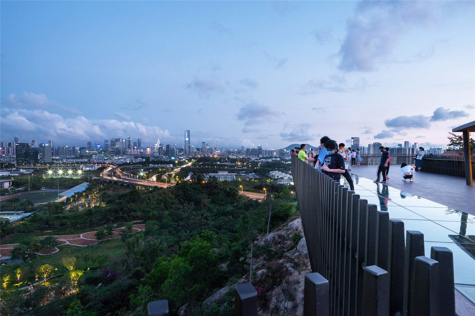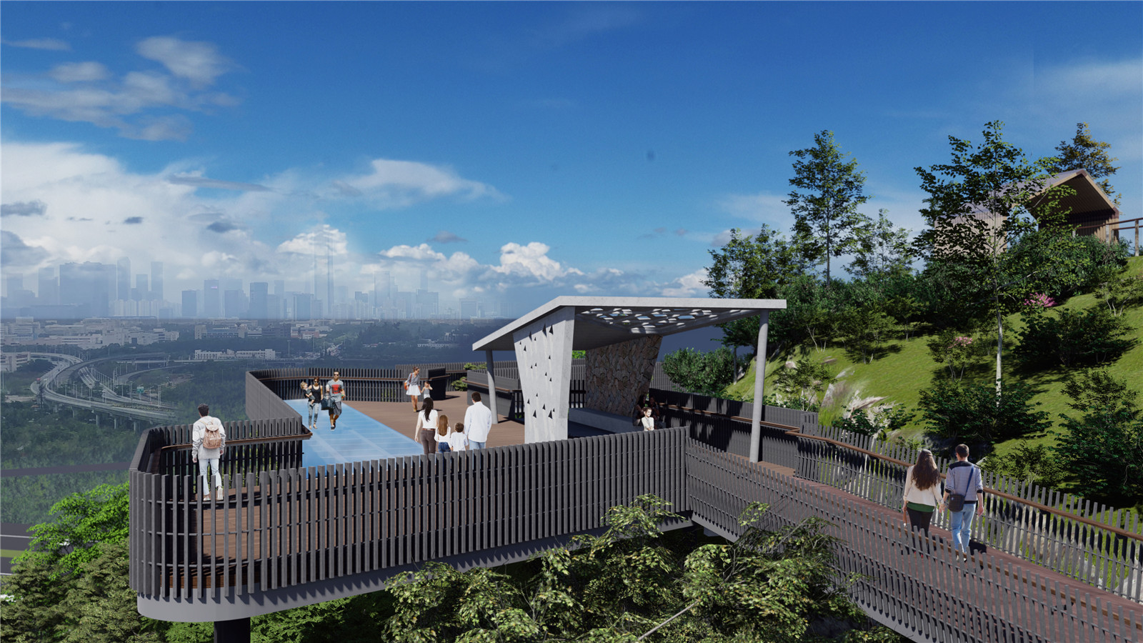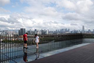 結(jié)合場(chǎng)地的條件與景觀視野,設(shè)計(jì)團(tuán)隊(duì)在不同的位置與角度布置了景觀亭,滿足人們休憩的需求,并通過(guò)景亭的設(shè)計(jì)引導(dǎo)人們的視野, 將城市的美好的天際線畫(huà)卷展現(xiàn)在眼前。玻璃觀景平臺(tái)可以透過(guò)玻璃看到陡峭山下的自然石塊,更是增加了驚險(xiǎn)刺激的游園趣味。