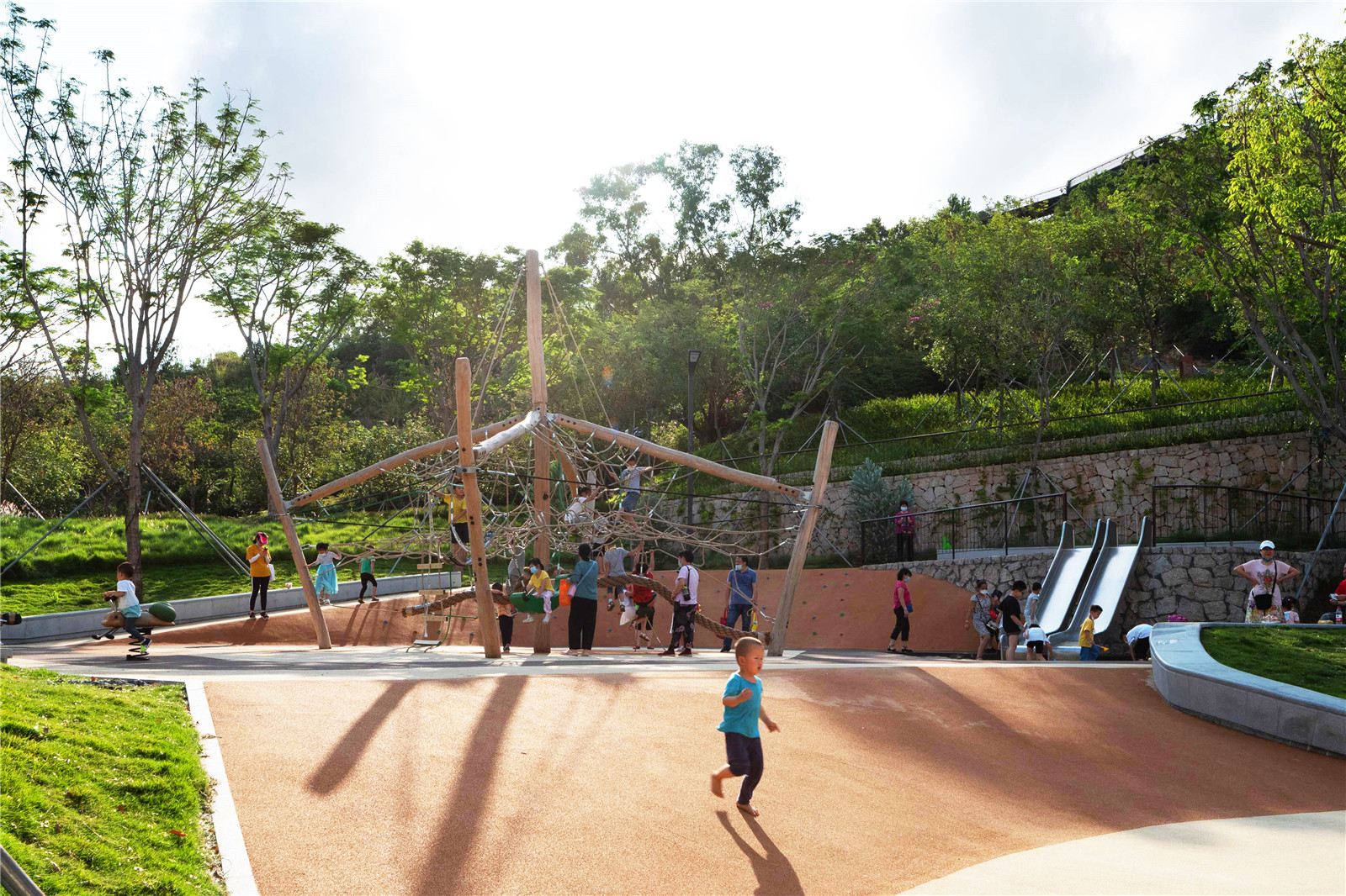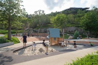 This is an all-ages activity ground molded from the landforms. The basic amusement facilities and rest areas provide good places for people to enjoy and relax. The safety matting area is not paved in a conventional manner with bright and contrasting color, but in earthy tones with the land. The play equipment is also considered with natural character. The children’s play area with mountainous character will bring refreshment and create a contrast to the community playground.