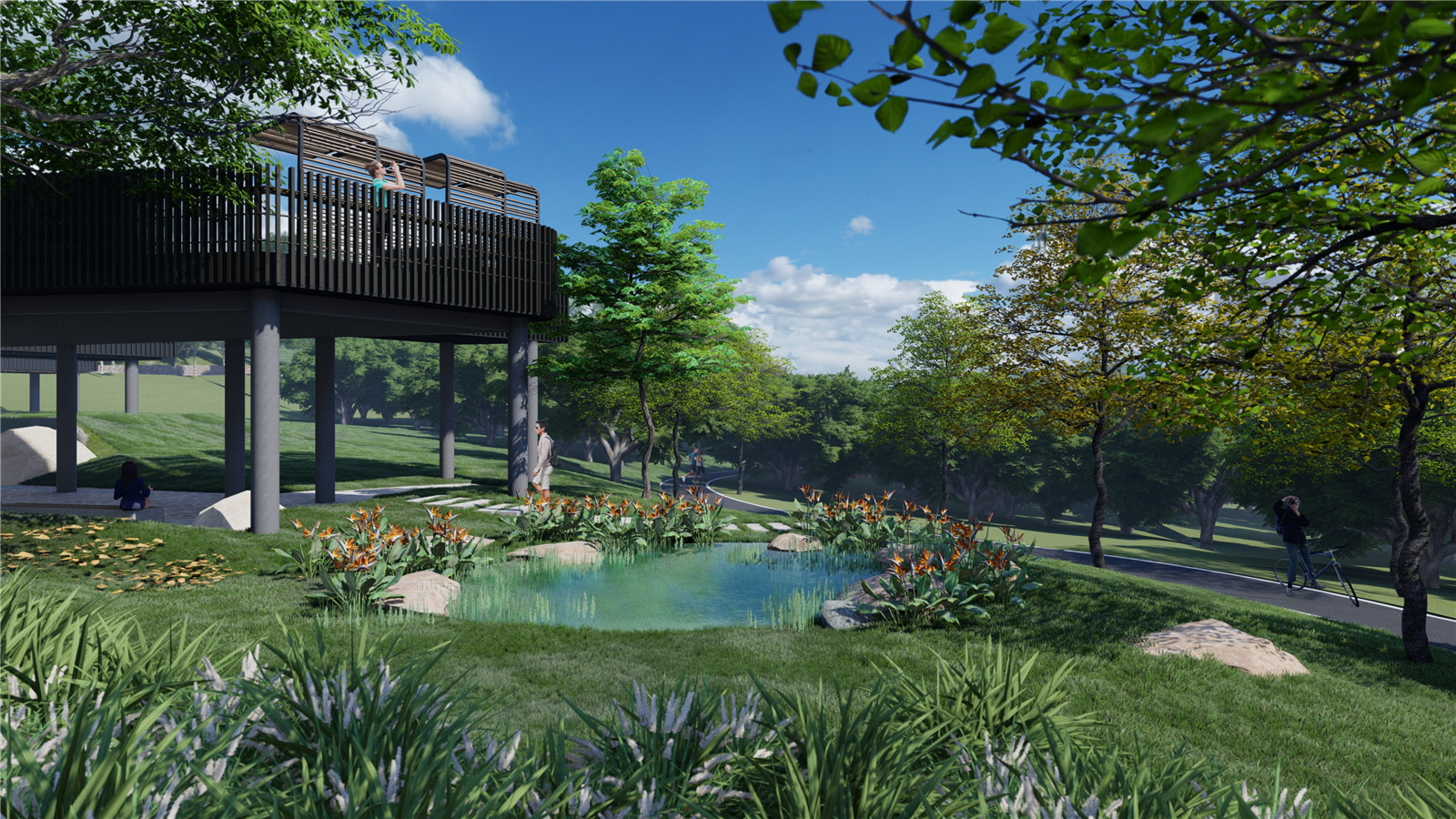 景觀設(shè)計(jì)師以“都市形態(tài)及自然景觀的融合”為公園規(guī)劃設(shè)計(jì)的切入點(diǎn)。景觀設(shè)計(jì)充分利用場(chǎng)地自然地形地貌,提升植物群落、動(dòng)物的棲息地及多樣性的生態(tài)品質(zhì),并落實(shí)海綿城市作為穩(wěn)固公園及重塑自然系統(tǒng)的策略。另一方面,在城市的不同方面展現(xiàn)和創(chuàng)造了多樣的空間和聯(lián)系,形成了節(jié)奏感和層次性的景觀系統(tǒng)策略。而公園活動(dòng)的規(guī)劃,通過(guò)多元的展覽及互動(dòng)性的公園活動(dòng),向公眾傳達(dá)生態(tài)維護(hù)及保育的理念,例如垃圾分類展覽,讓公眾在自然輕松環(huán)境中感受及了解保護(hù)生態(tài)的可持續(xù)理念及實(shí)在的行動(dòng)。