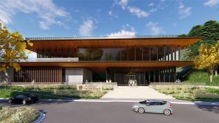 The main entrance plaza merges with the natural slope