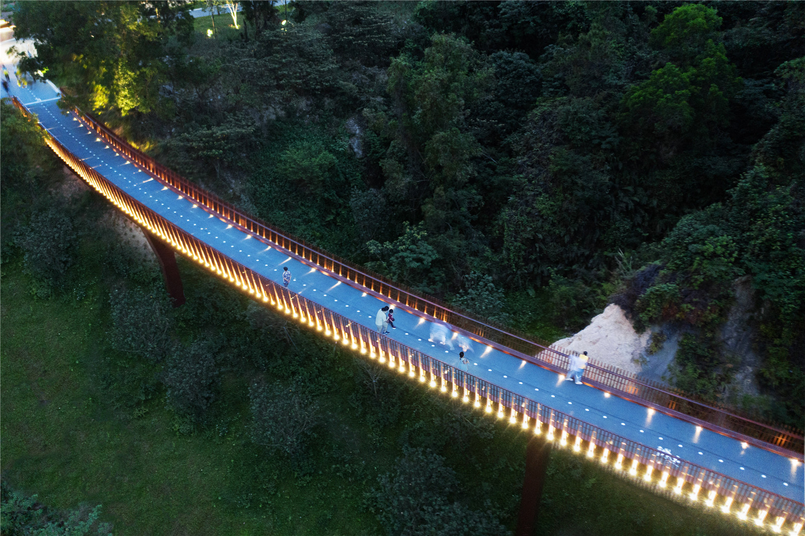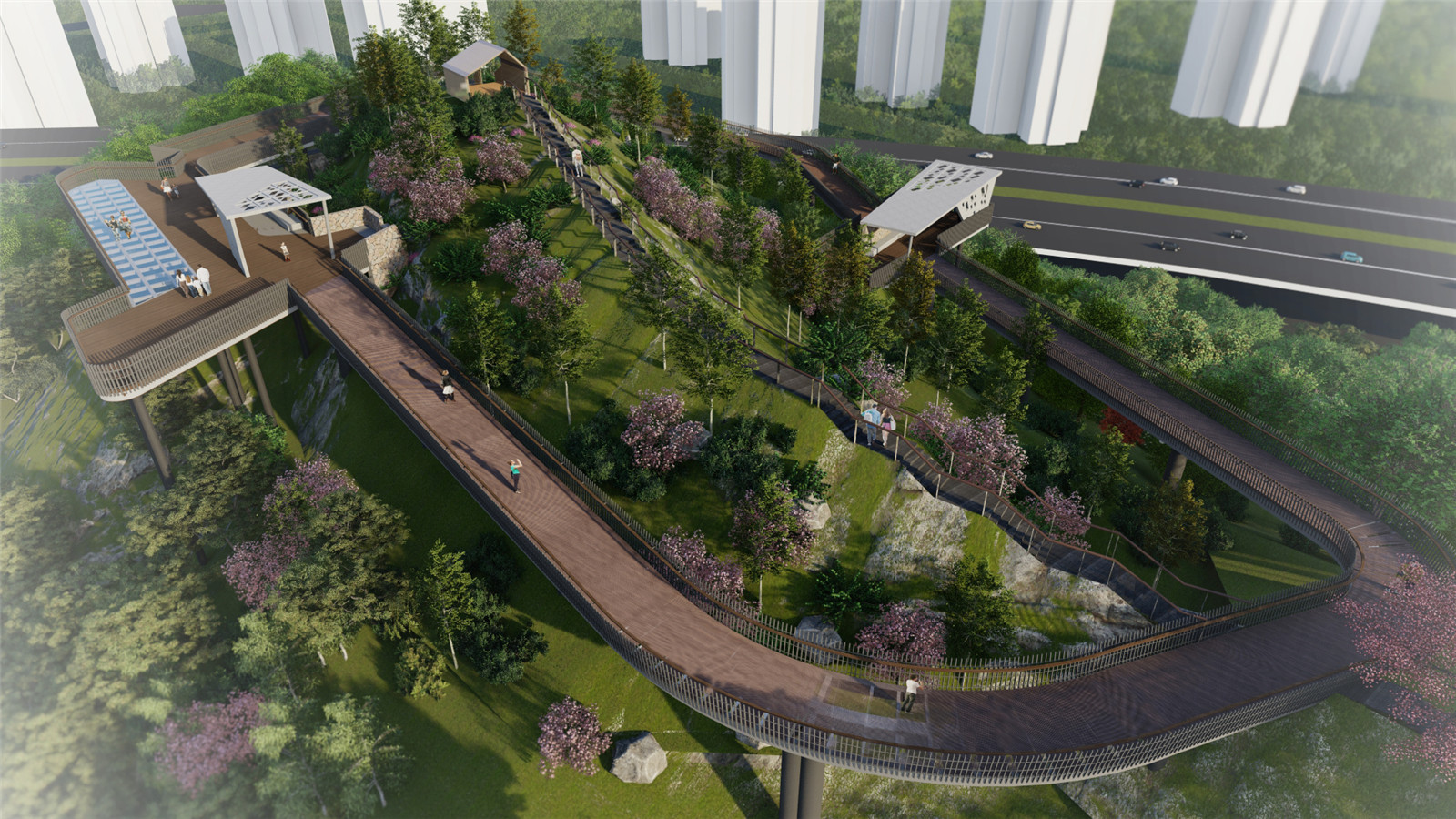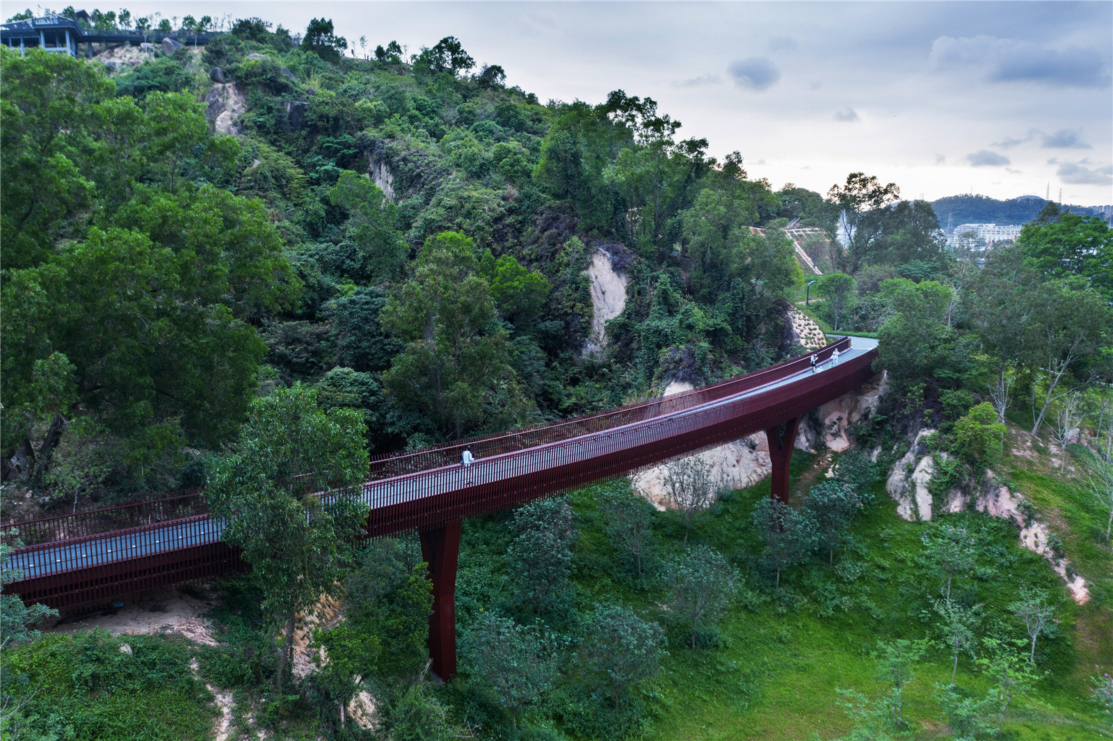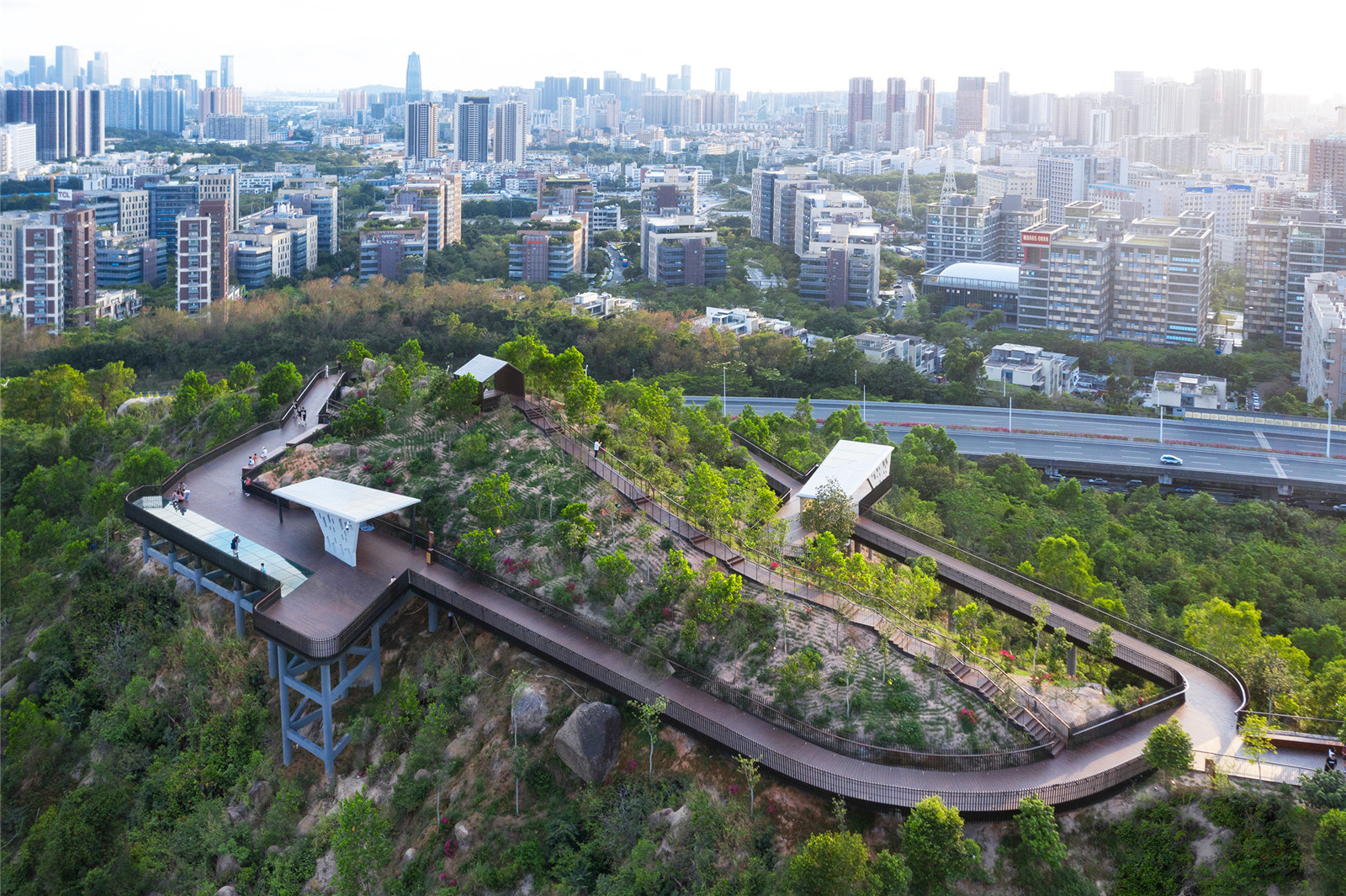 宛如一個(gè)精致的皇冠戴在山頂,將人行的動(dòng)線抬升,剝離山地的地面,既能保護(hù)山頂區(qū)域的自然植被與地貌,減少人的行為對(duì)于自然表皮的干擾與破壞,也能提供更加開(kāi)闊舒展的步行體驗(yàn)。在快節(jié)奏高密度的城市生活空間中感受云中漫步的浪漫與悠閑。